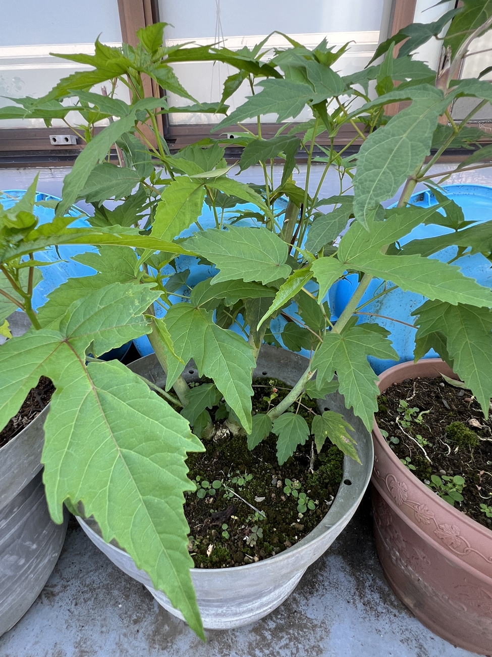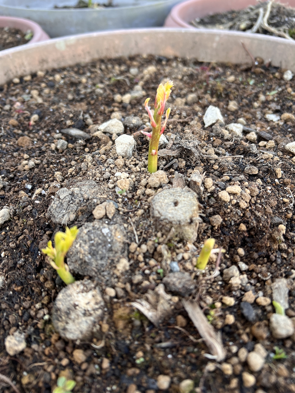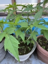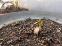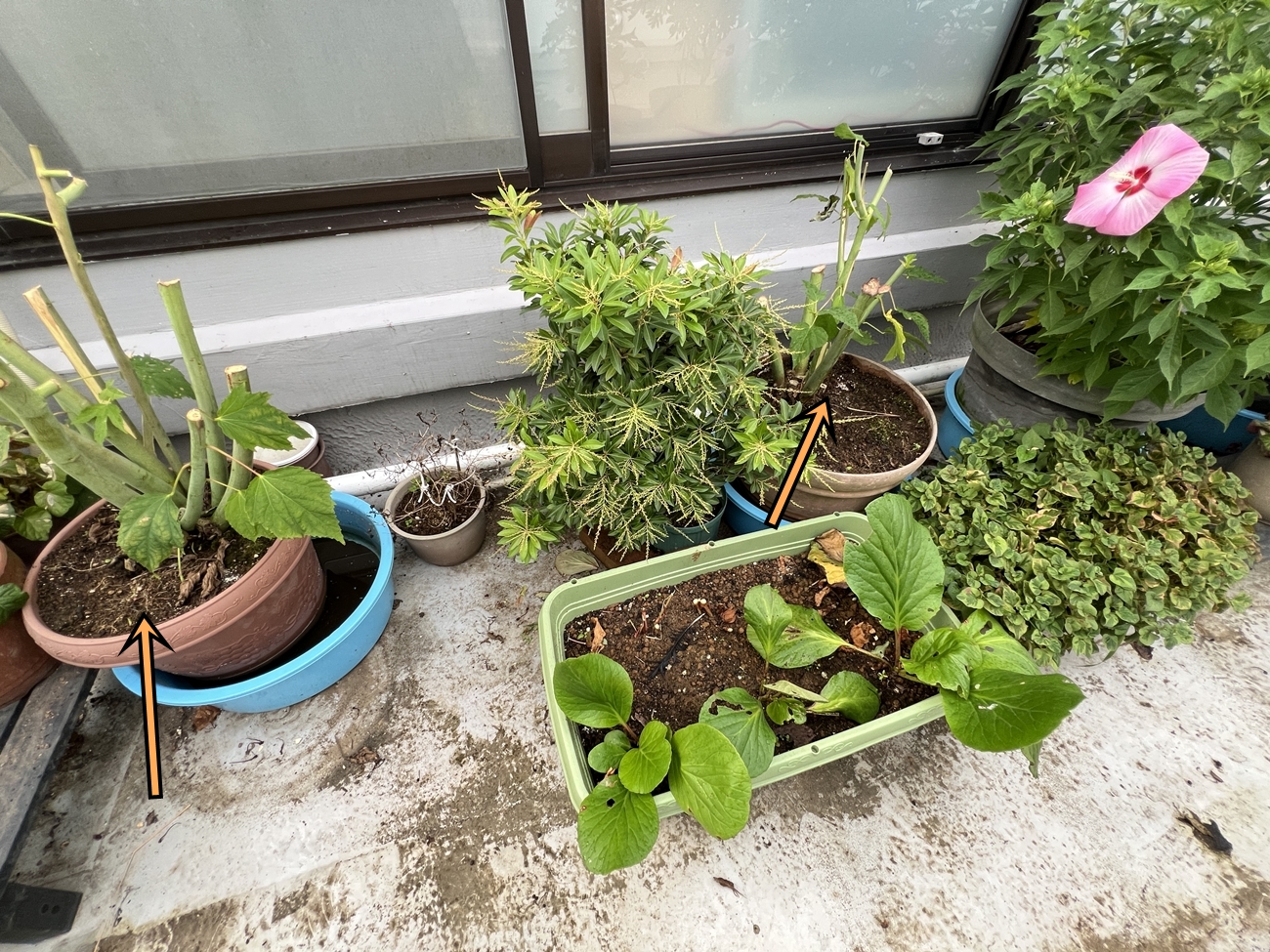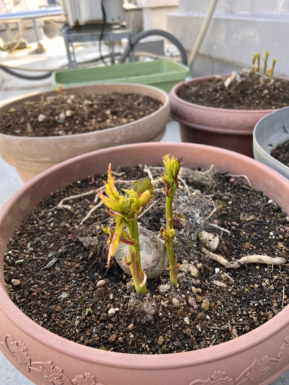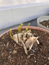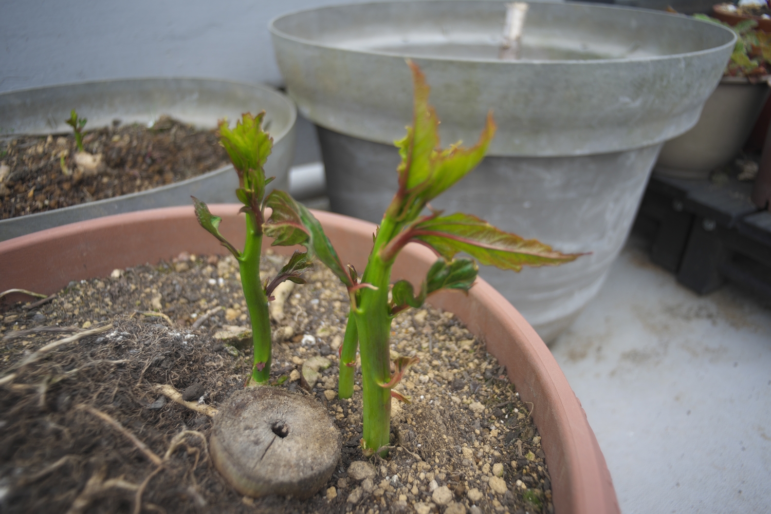 夏場に派手な花を咲かせるタイタンビカス、2年目の昨年秋。株分けをして2→4鉢に増えました | 株分け後の新しい苗・・・ようやく小さな新芽が伸び出て来ました\(^o^)/ | 元から有った古い苗・・・数個のしっかりとした新芽です |