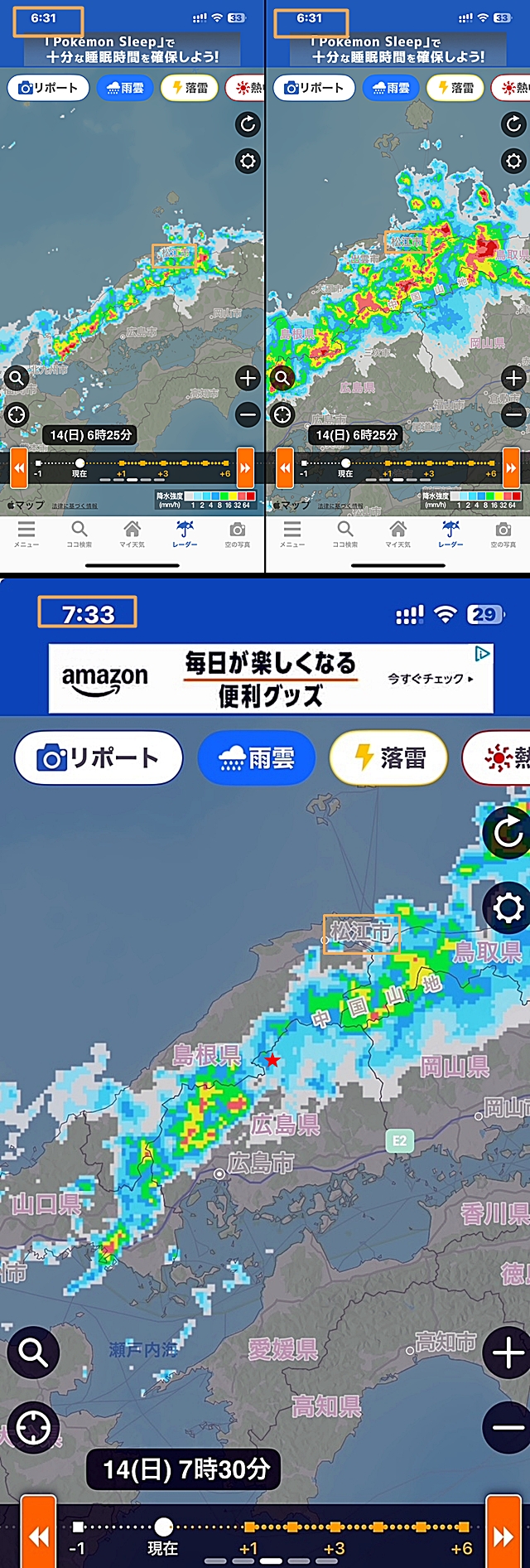 大雨と言う程では無かったのですが、かなりの吹き降り状態になり島根県・松江市では大雨情報が発令されるまでに。