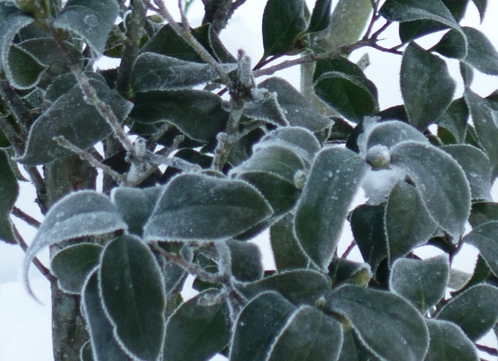 霜が降りた椿の葉っぱも、とっても冷たそうですね・・・・