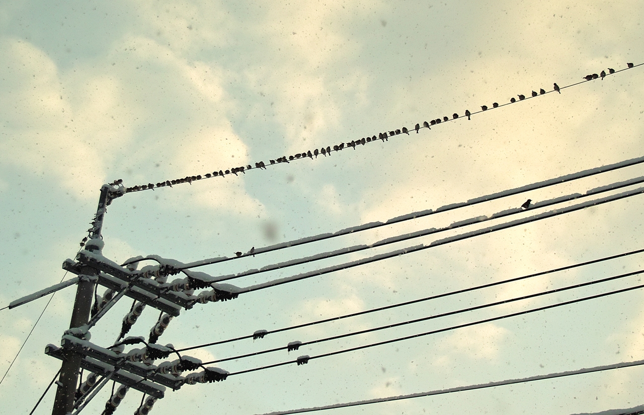 鳥さん達の鳴き声が聞こえて参りました・・・上を見上げてみると、電線の上にはスズメがイッパイ!