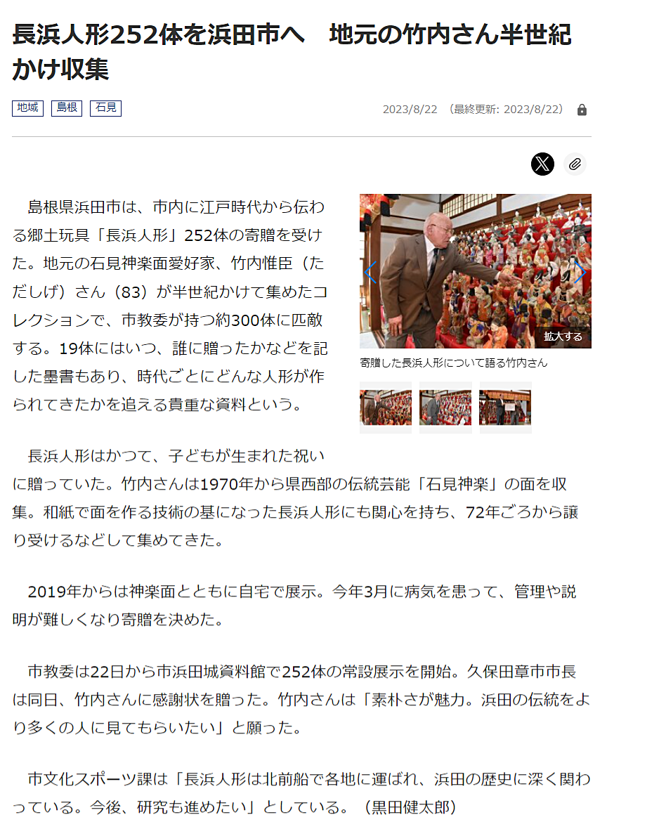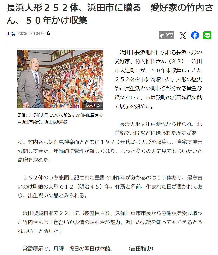 長浜人形に関しては、こちらの記事を見つけることが出来ました。(両新聞社様の貴重な情報を拝借させて頂きます)