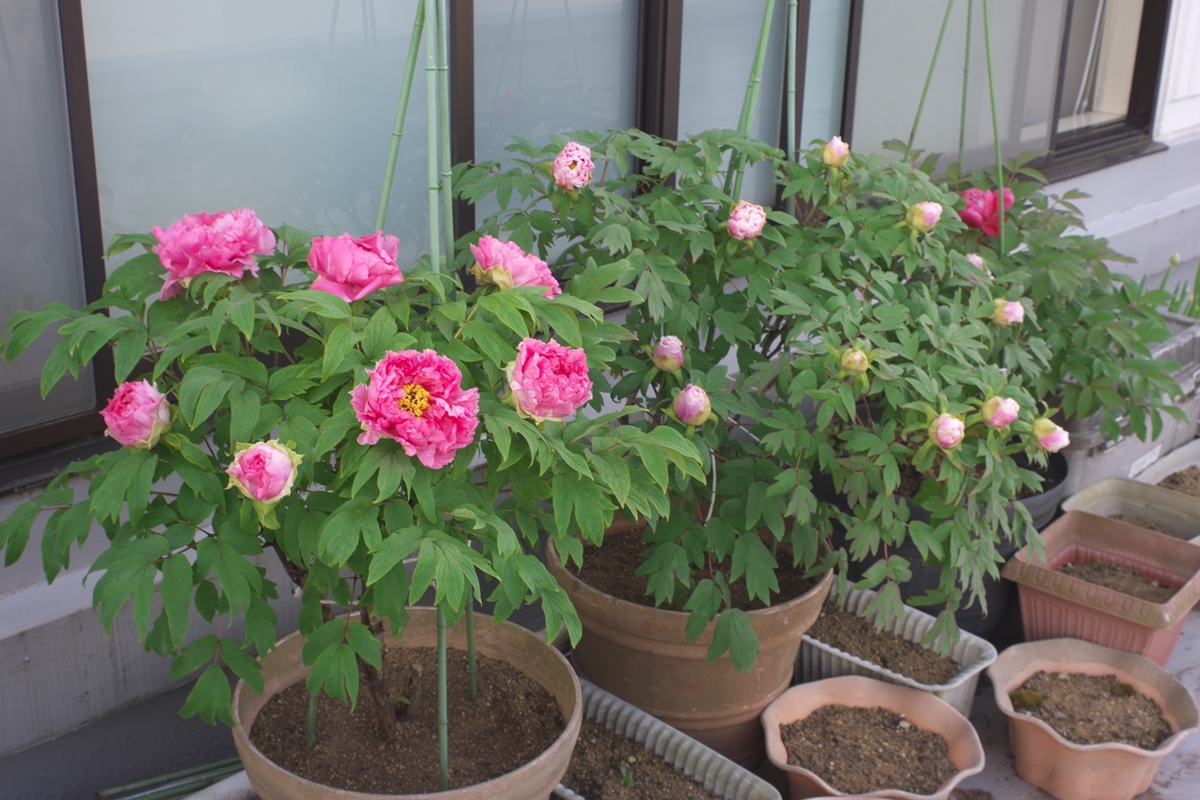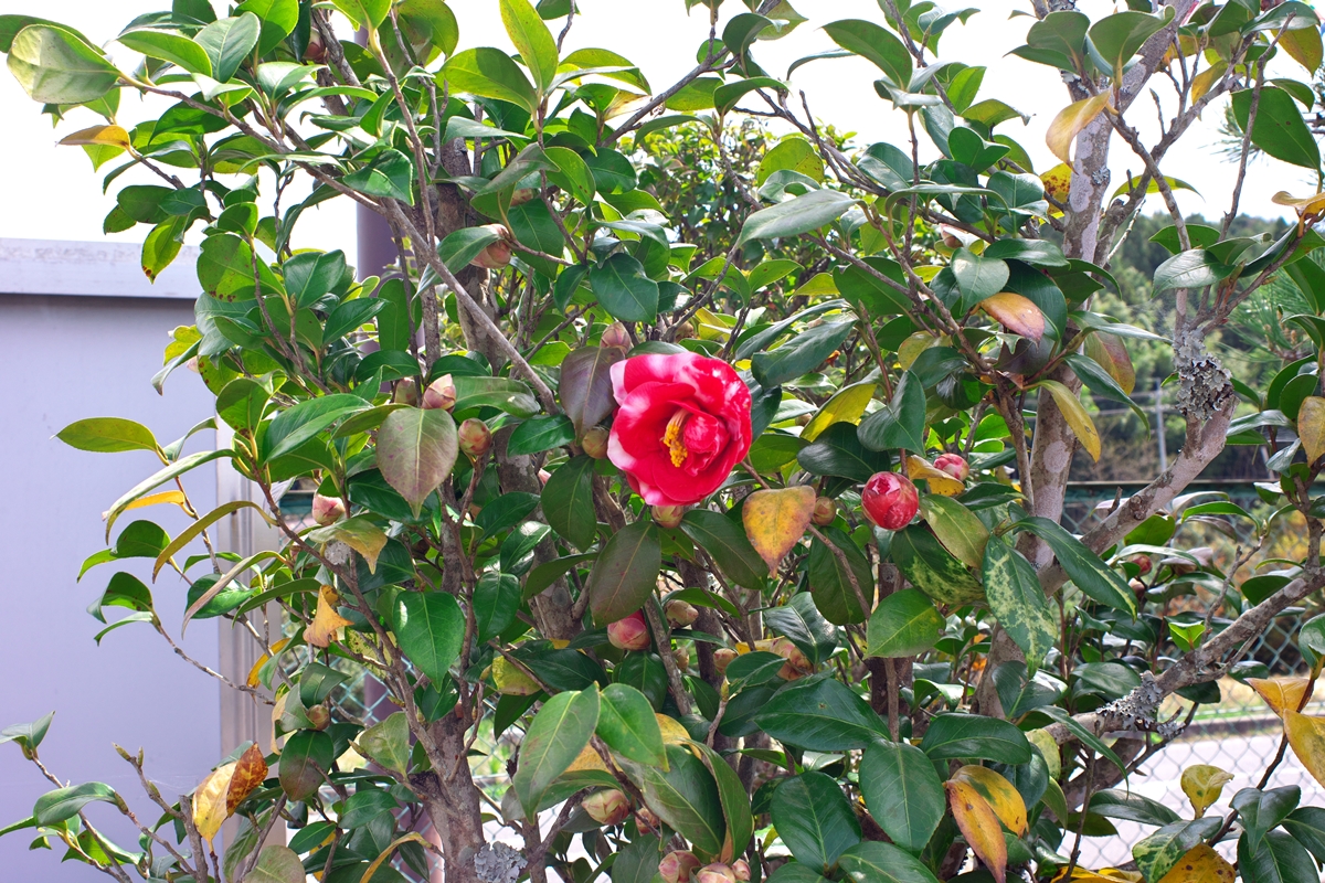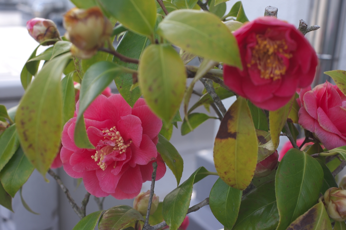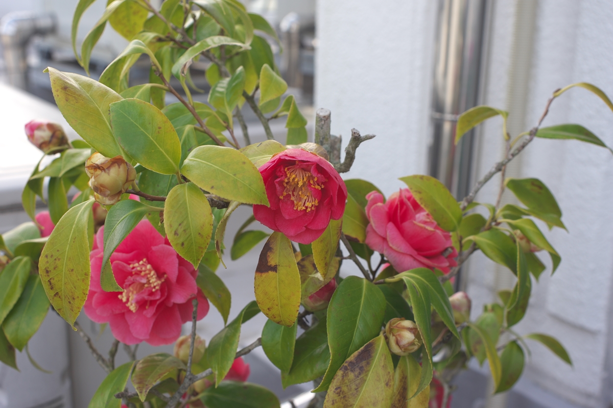 牡丹の3つの植木鉢の横に並べている(枯れかけていた)椿ですが、沢山ついている蕾。