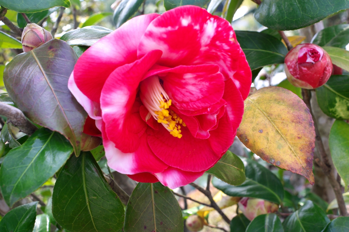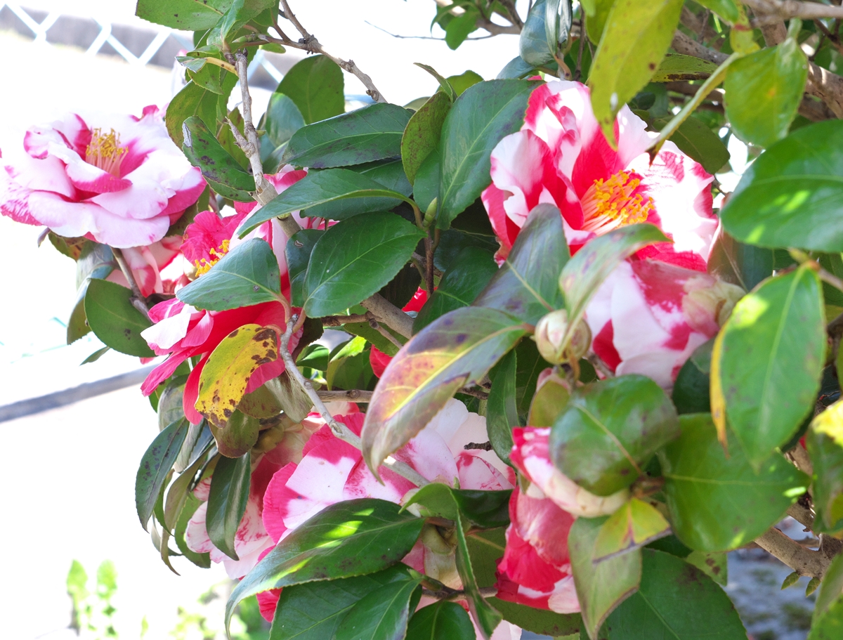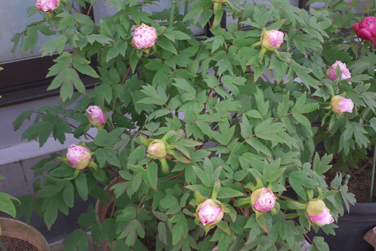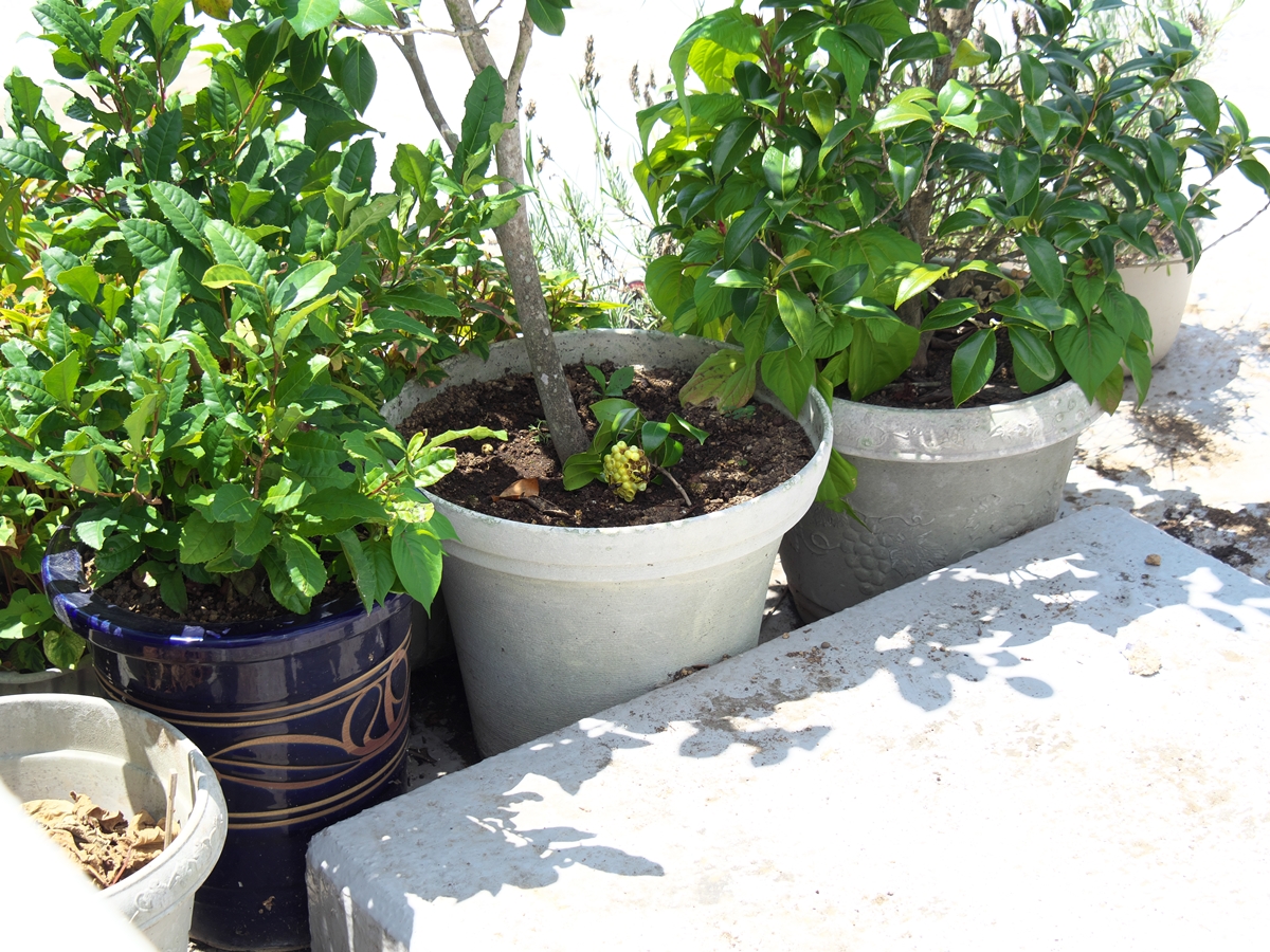 牡丹の3つの植木鉢の横に並べている(枯れかけていた)椿ですが、沢山ついている蕾。