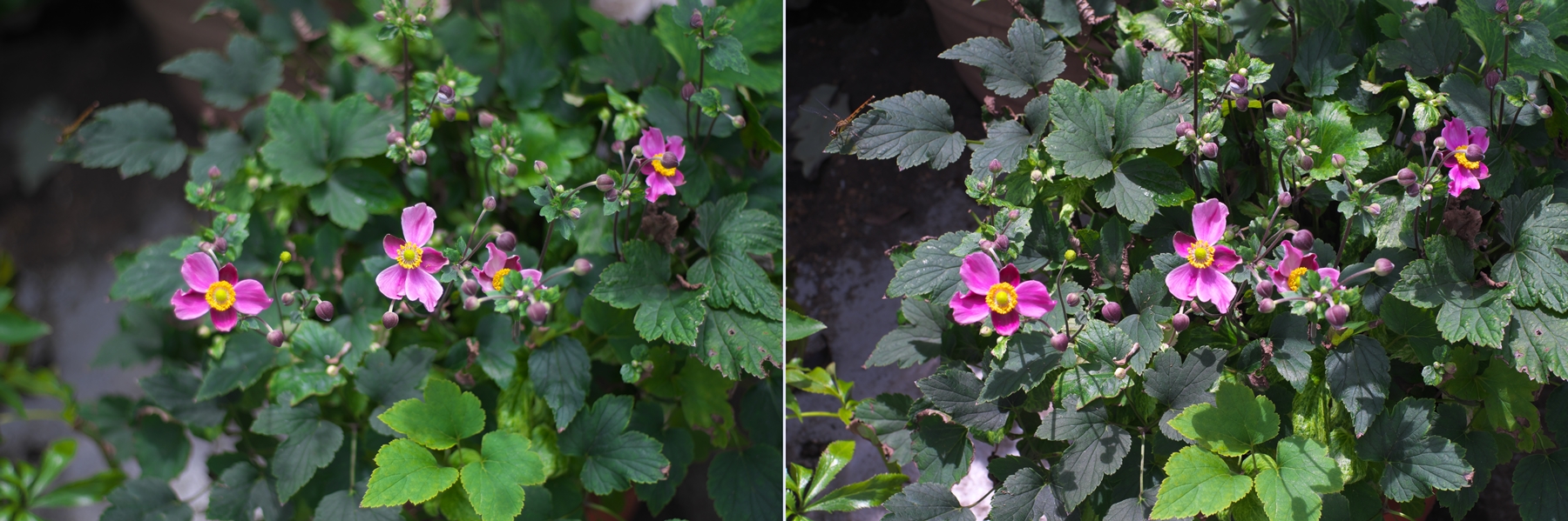 向かって左側:ピンク色の花は昨日に開花して、同日の夕方頃から少しずつピンクのお色が。