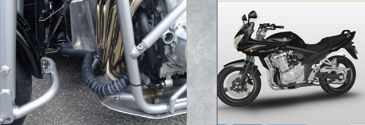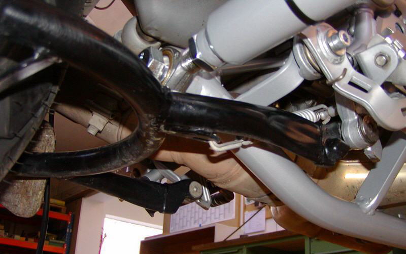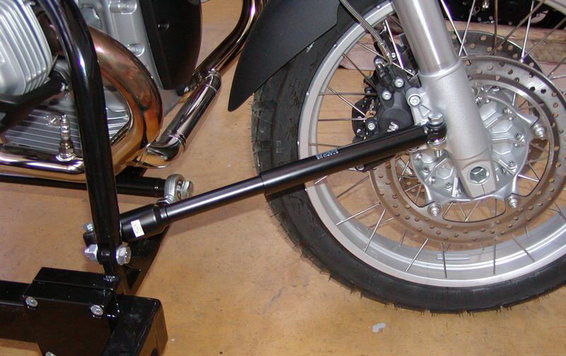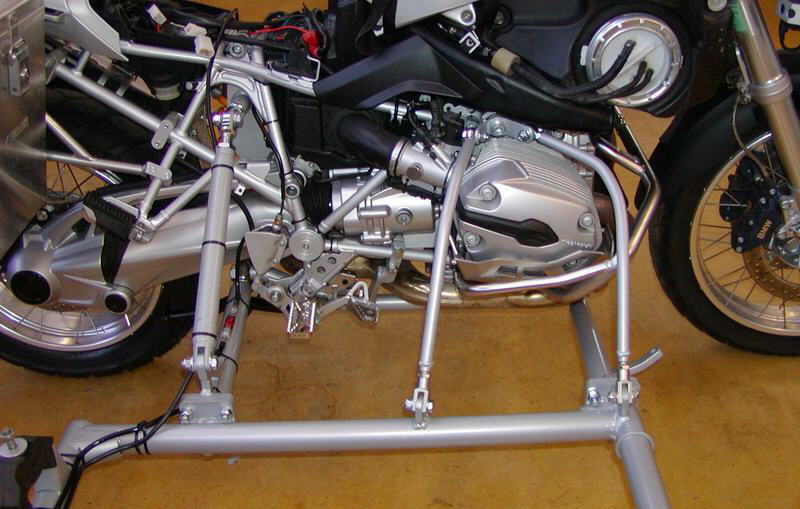 EMLオリジナルのセッティングフレームですね。 カーと固定されたフレームは、バイクを下方から潜って(バイクを抱き込むような恰好で)左側でバイクフレームに固定されていますね。