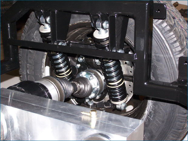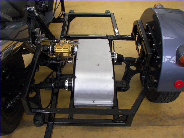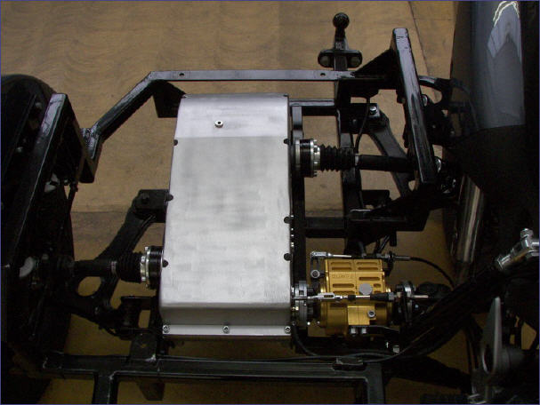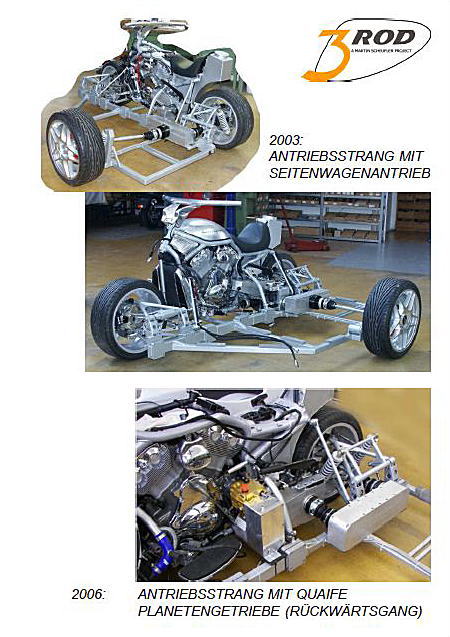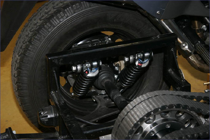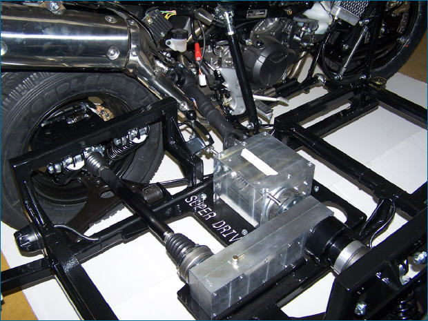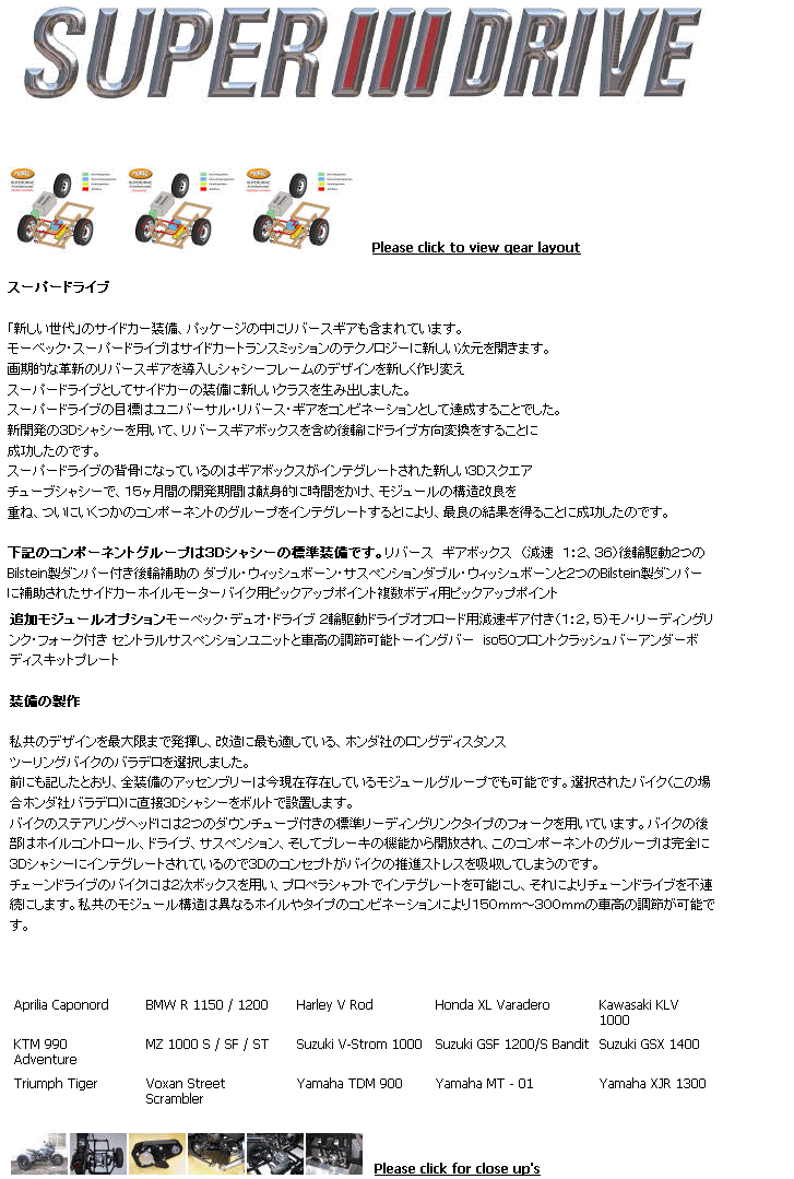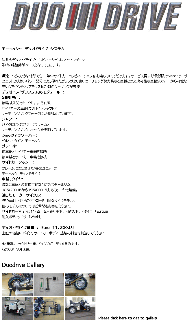 次は 2.Duo Drive System です。 バイク後輪のシャフトから動力を伝達して、サイドカー側の車輪を回してしまおう、という画期的なモノだと思われます。 これに関しては、JSCの掲示板にて”バイク後輪とサイドカー側車輪との回転収差は、どのように解決しているのか・・・ビスカスカップリングを使っているのか?”という質問が書き込まれました。