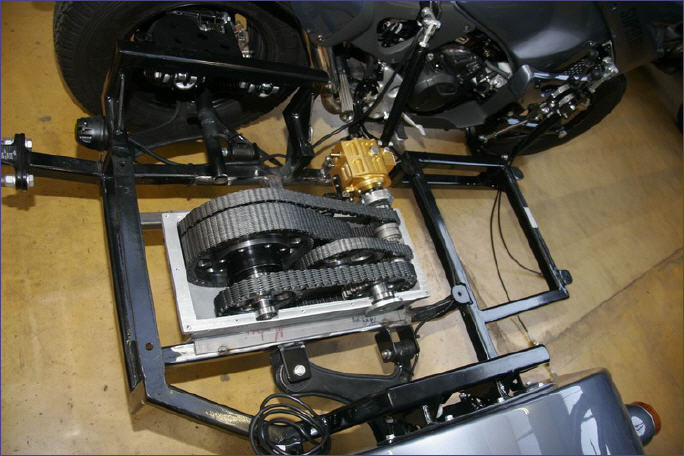 エンジン側(プライマリードライブ)より動力を取り出して、ギアボックスを介してバイク後輪(元々のチェーンドライブは使わないで)とサイドカー側の車輪に伝達するモノだそうだ。そしてリバースギアも備えている為、バックもOK! 凄いシステムだなあ・・・