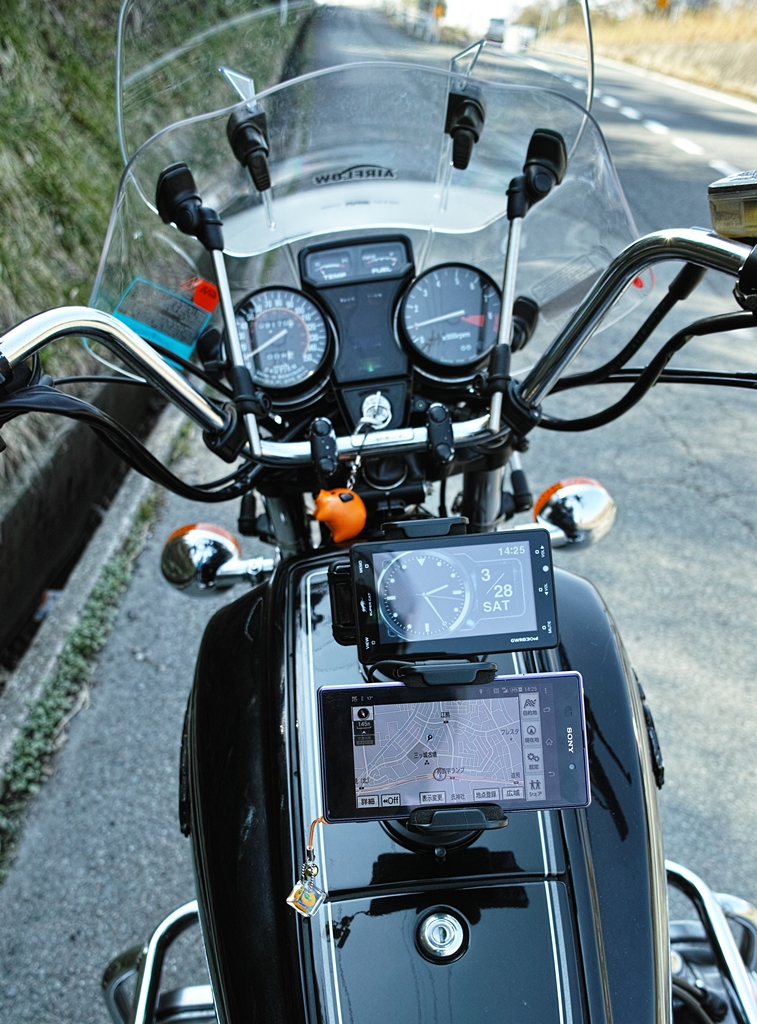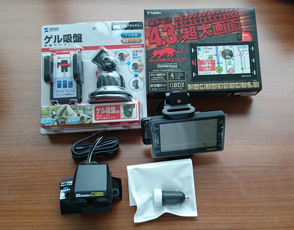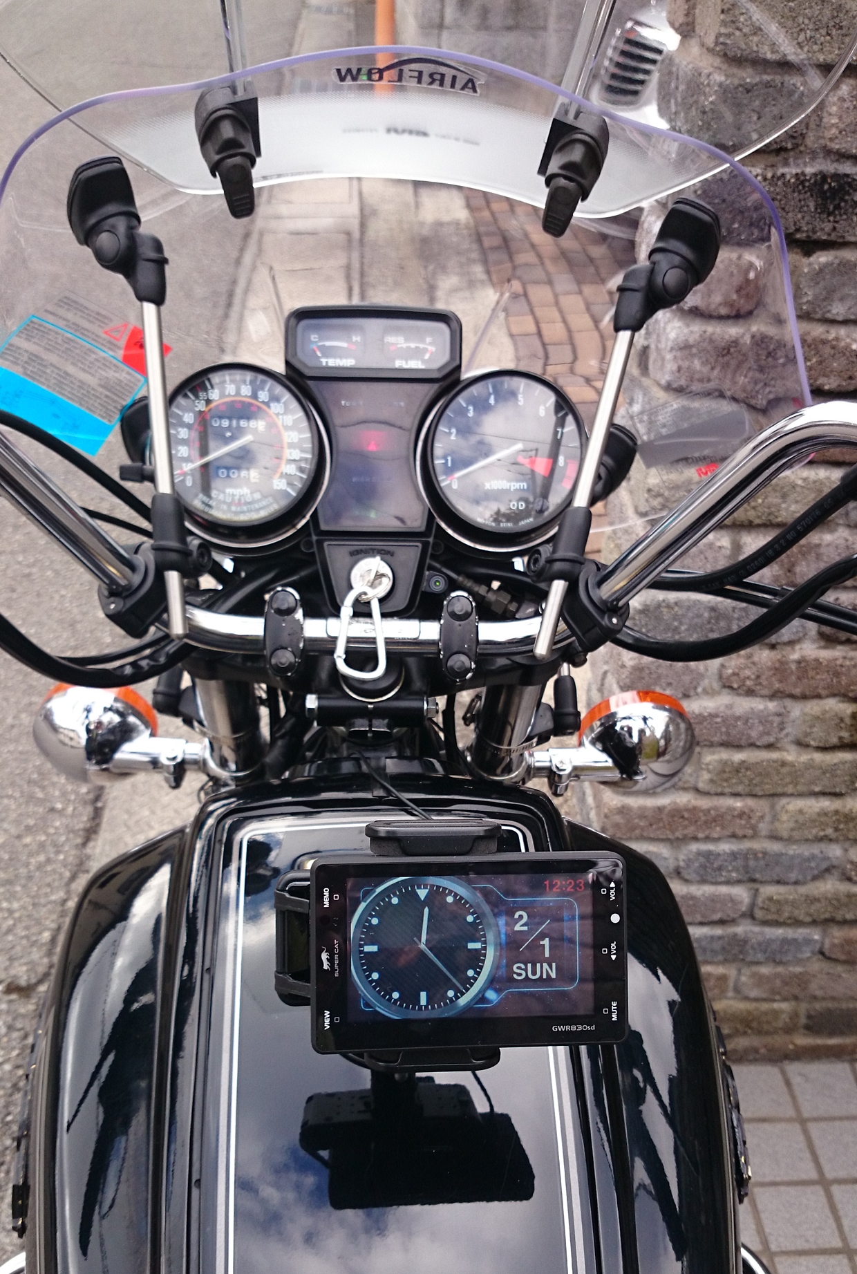 選曲をしたくなる時も有るでしょうから、レーダー探知機(待ち受け画面で時計を表示させています)の手前のホルダーに固定してもイイかなと。