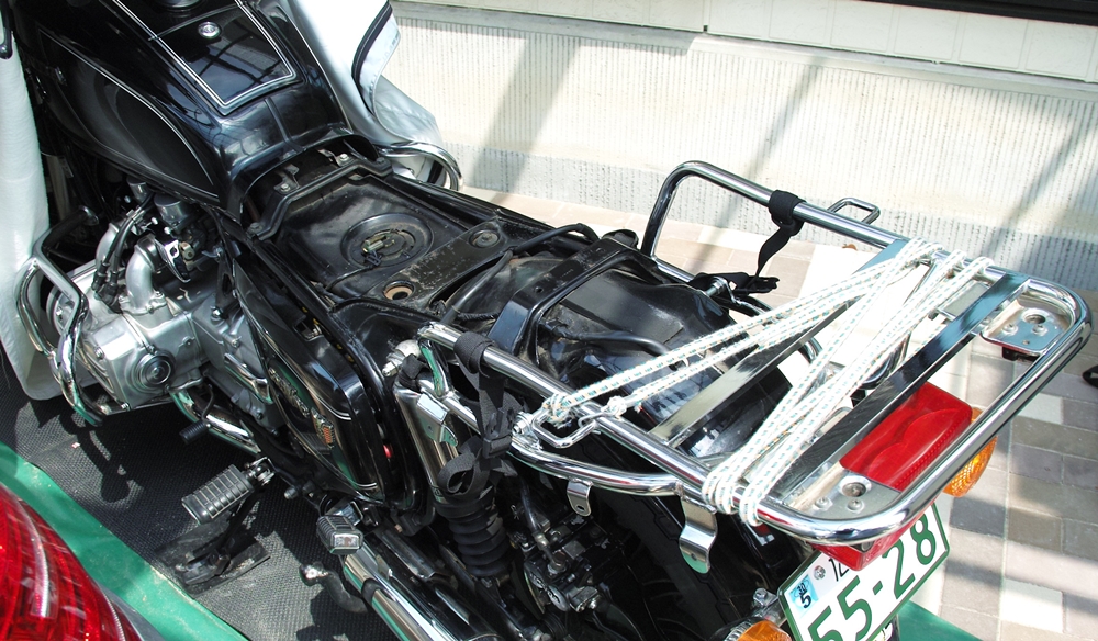 リアキャリアに、シートバックを固定して使うのが”お決まり!”となりました。