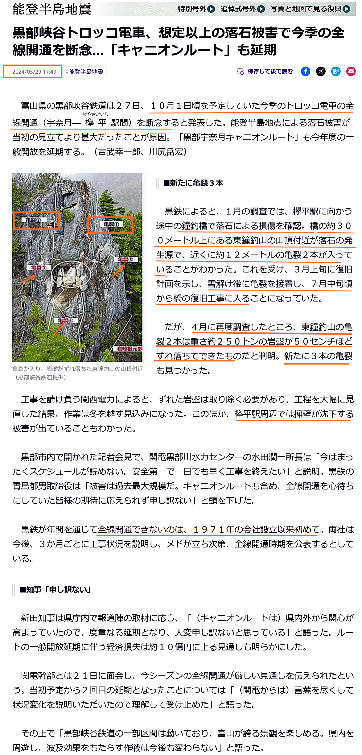 実は黒部宇奈月キャニオンルートの運行開始日が凡そ決まりかけていた頃・・・・能登半島地震による落石で、終着駅:欅平(けやきだいら)手前の