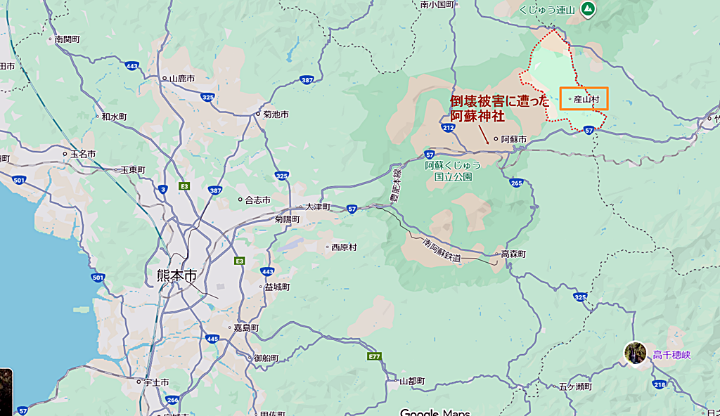 今回の震源地となった産山村の場所を拝見しまして、2016年時の震源地となった益城町から北東に伸びた断層・・その延長線上に在るのではないでしょうか?
