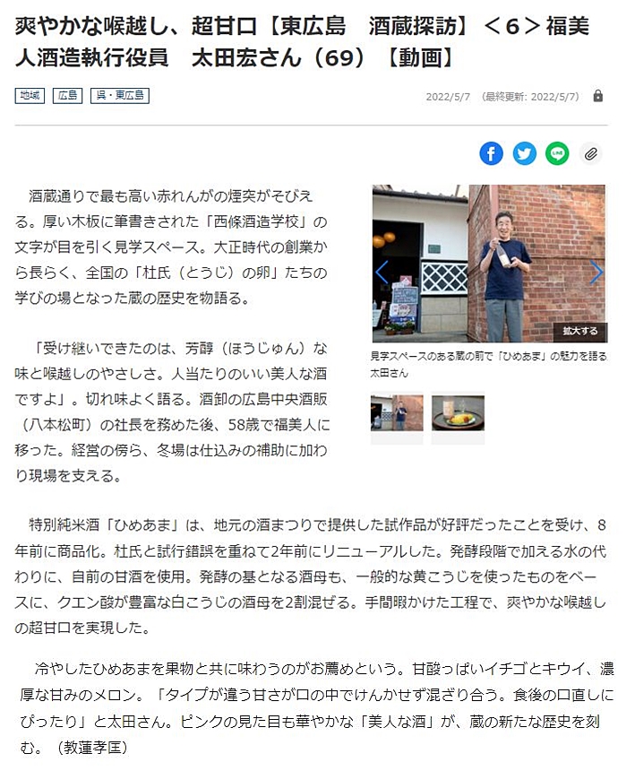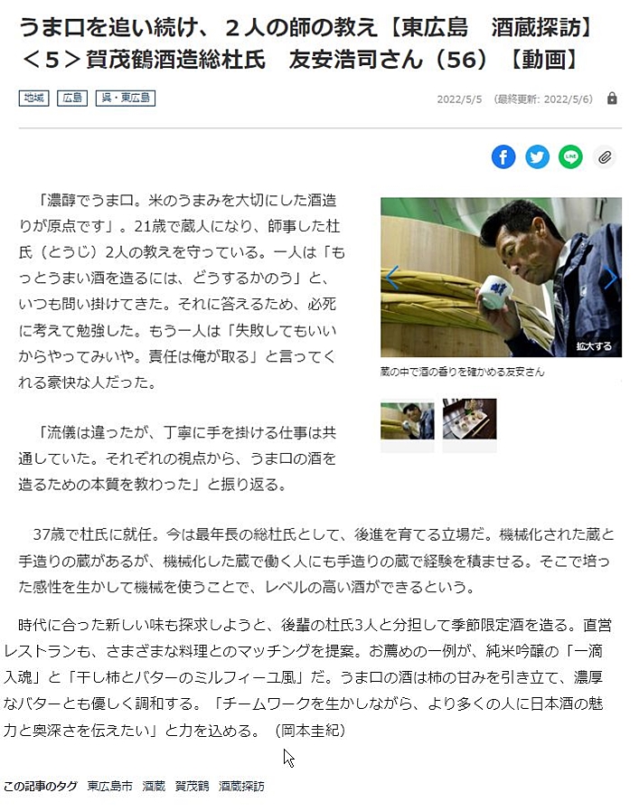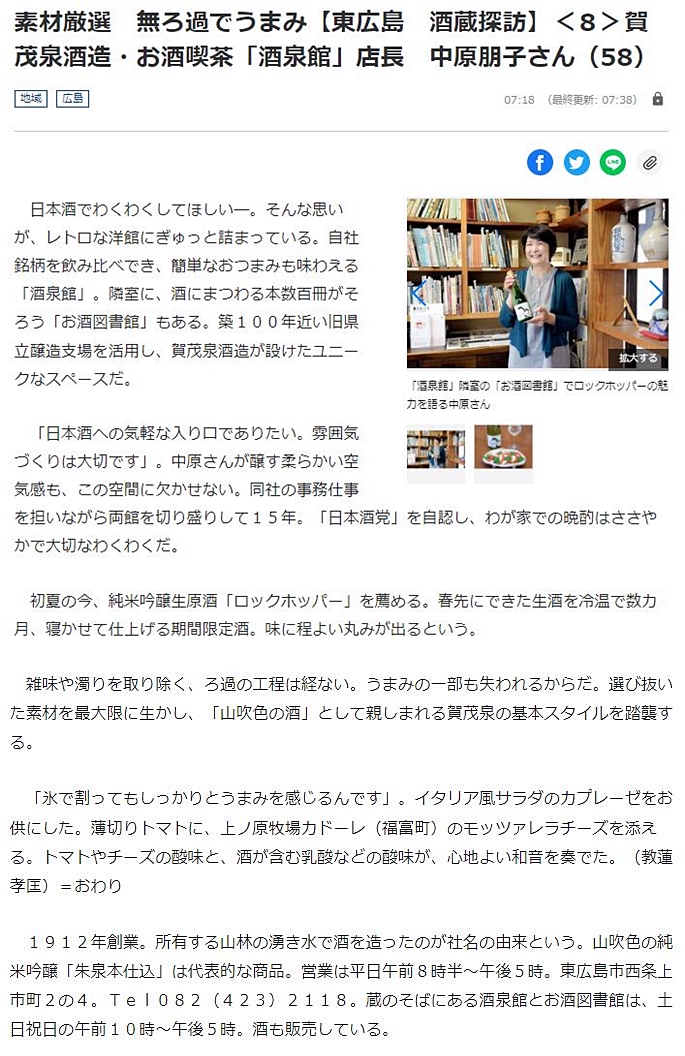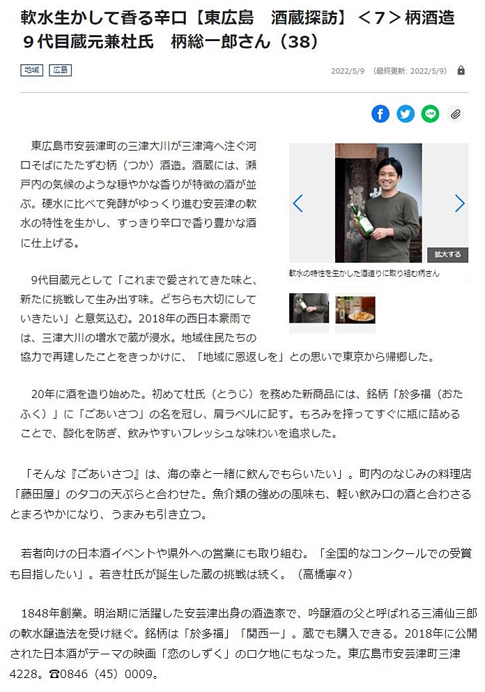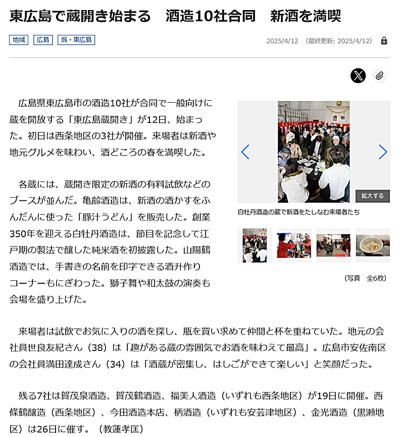自宅で新聞を拝見しておりましたら、地元・東広島市の”日本酒・酒蔵探訪記”のシリーズが掲載されているのを知りました。