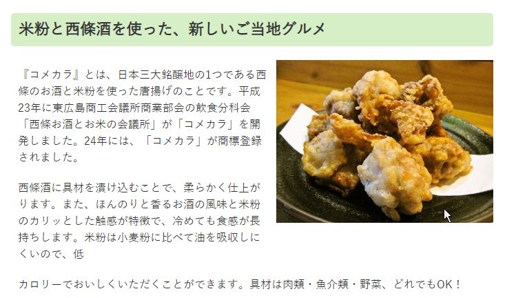 フッと、コメカラなる文字が目に入りました。(メニュー一覧には”西条名物”と追記されていまして)