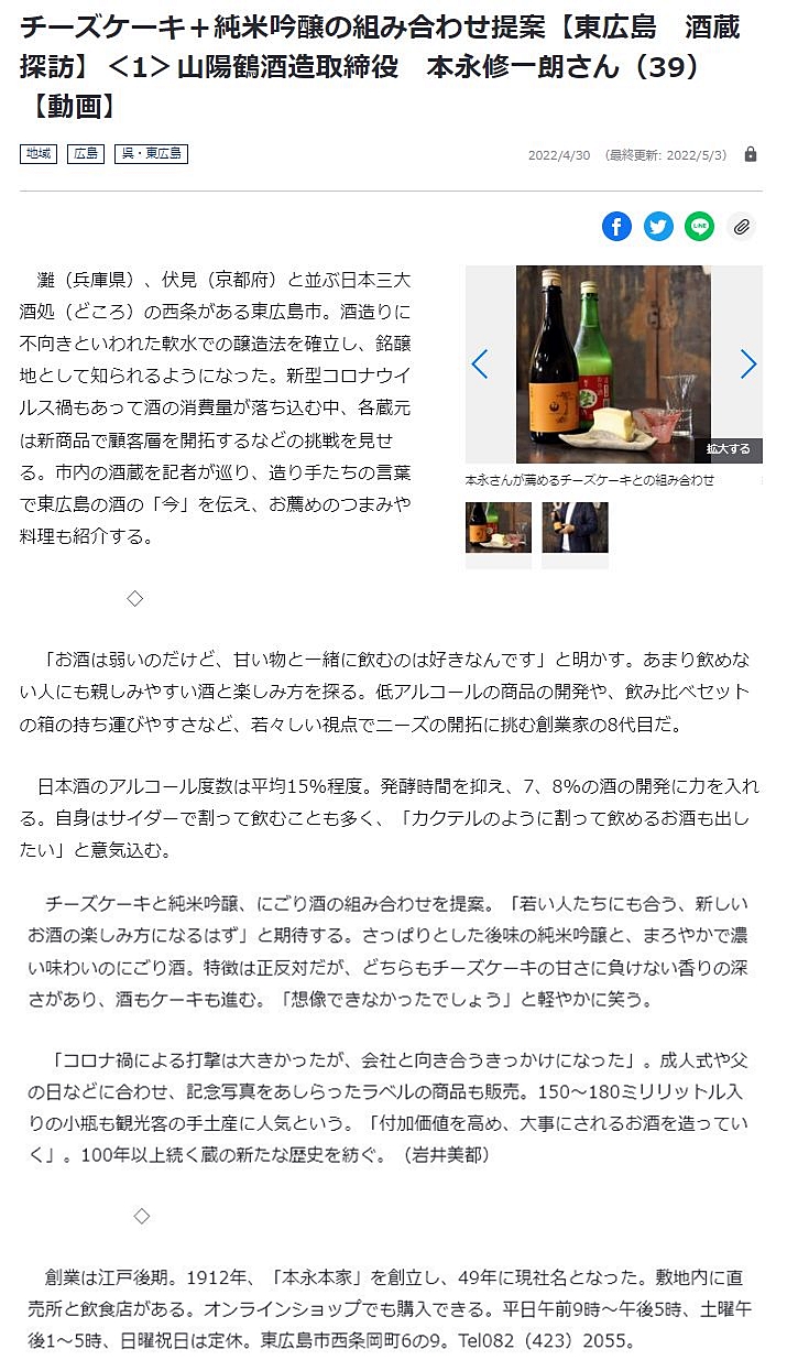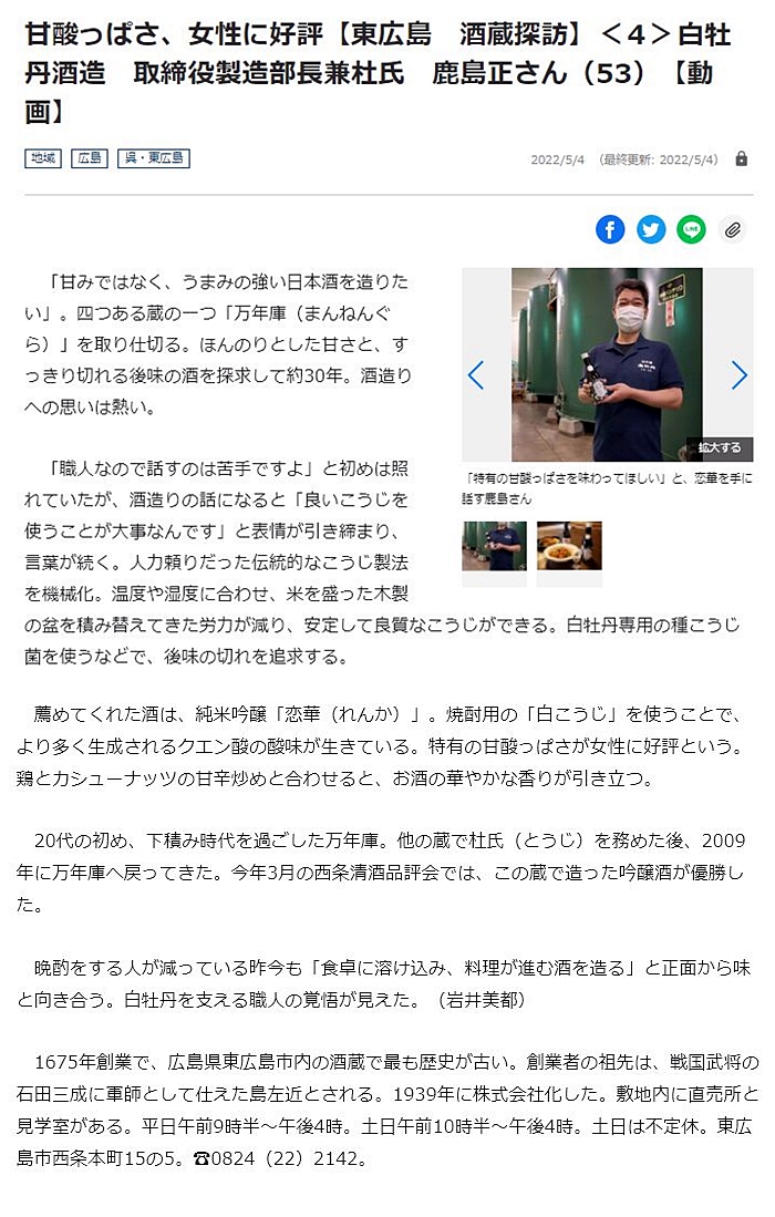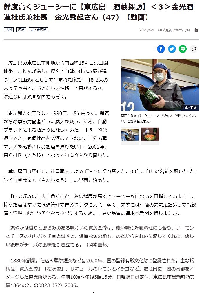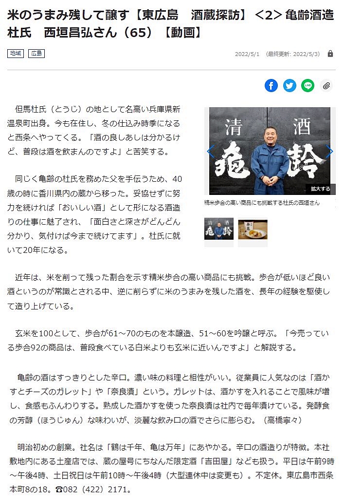 実は、今年の5月に地元の新聞社さまの番組:【東広島 酒蔵探訪】②亀齢酒造さま