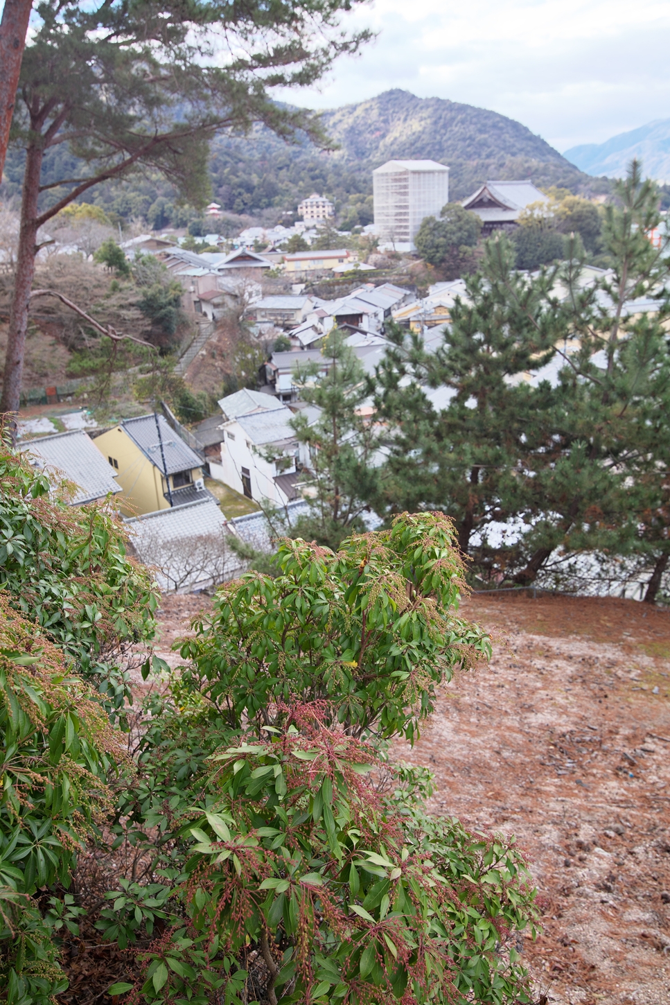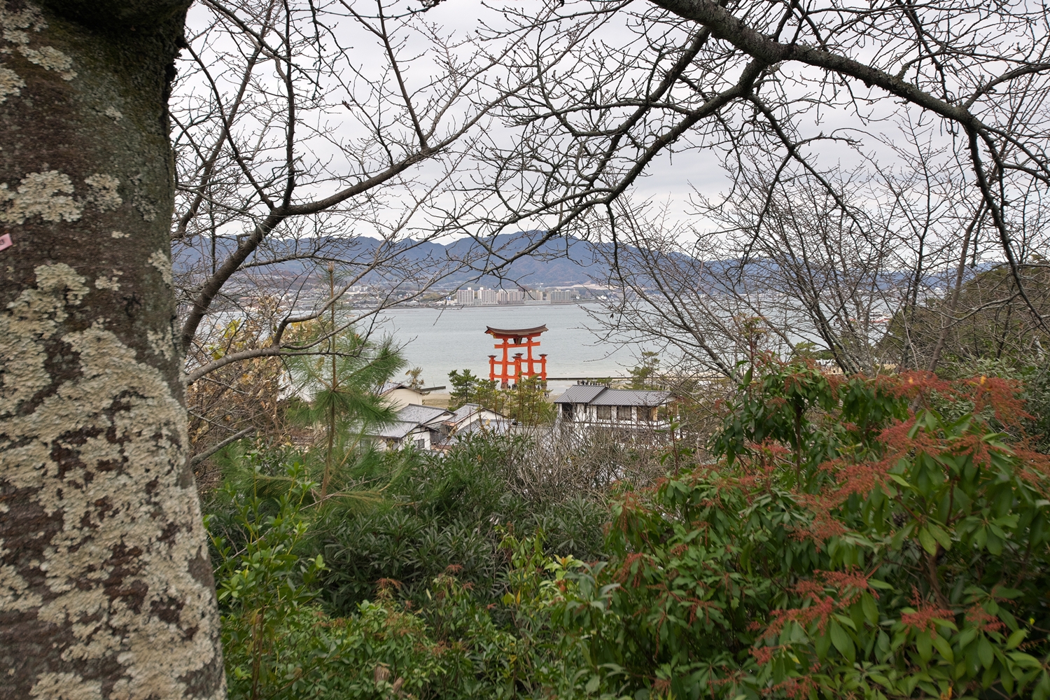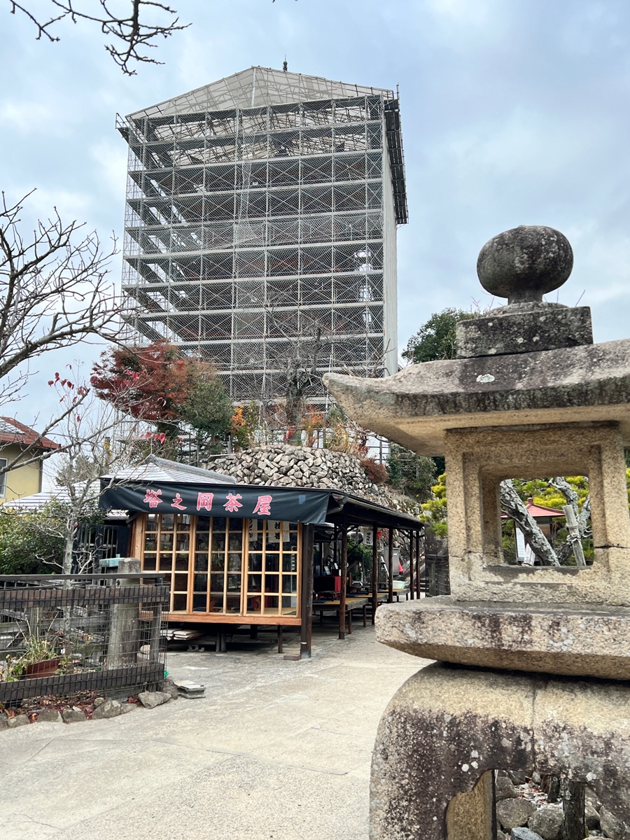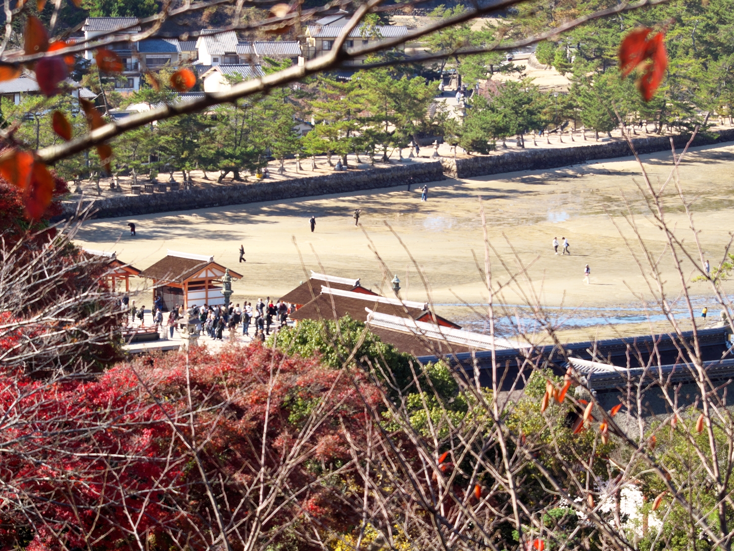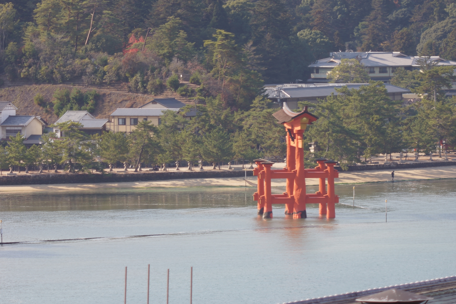 今朝9:30が干潮でして、その1時間後の今。鳥居右側の砂浜はどんどん海水の下に | 唯一、この方向で紅葉が残っているようです | 宮島交流館・裏に出る三差路脇のアセビの群生。日当たりが良くて元気イッパイ! | 無理矢理、多宝塔を写し込んでみました💦 | 下手くそ画像m(__)m | 千畳閣左脇の大銀杏も 落葉が大部分になりました | 足場と養生シート越しの五重塔・・・早く修復工事が終わって欲しいです |