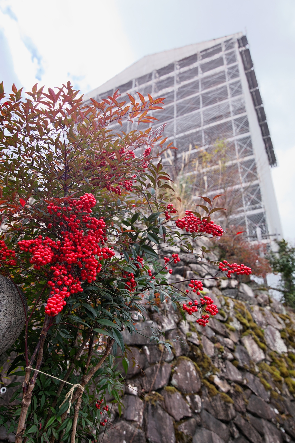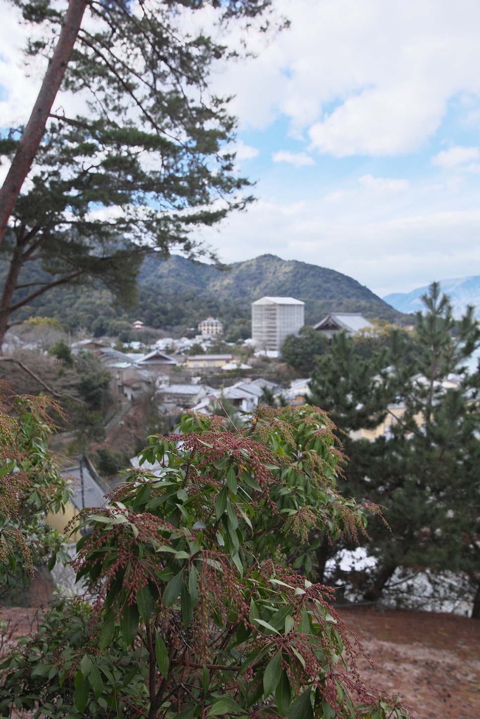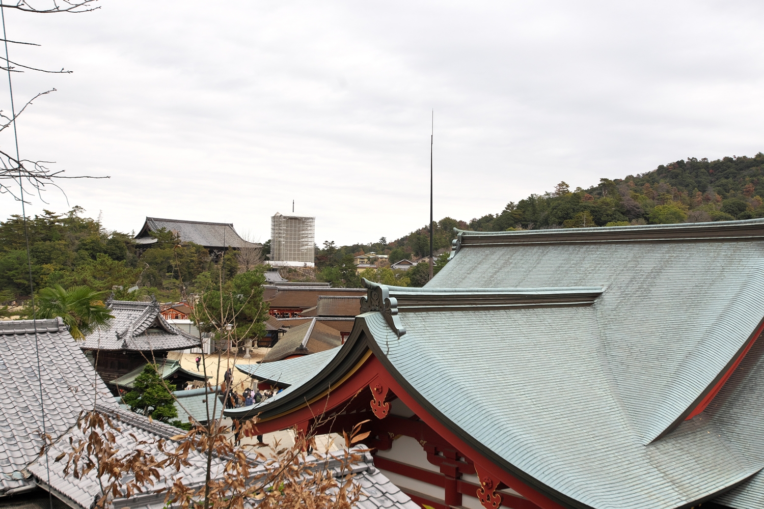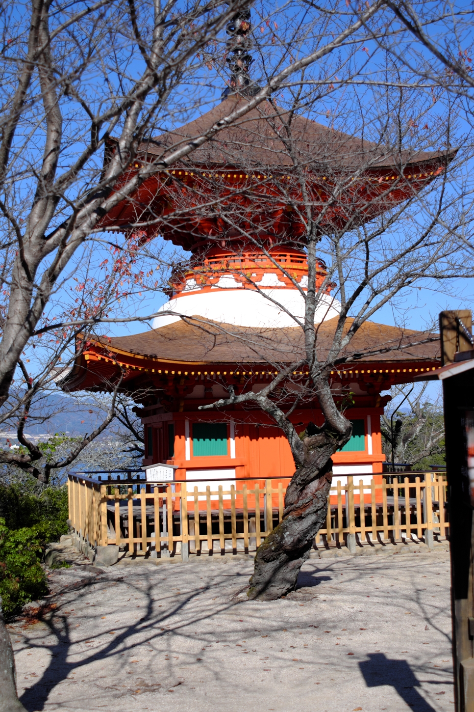 今朝9:30が干潮でして、その1時間後の今。鳥居右側の砂浜はどんどん海水の下に | 唯一、この方向で紅葉が残っているようです | 宮島交流館・裏に出る三差路脇のアセビの群生。日当たりが良くて元気イッパイ! | 無理矢理、多宝塔を写し込んでみました💦 | 下手くそ画像m(__)m | 千畳閣左脇の大銀杏も 落葉が大部分になりました | 足場と養生シート越しの五重塔・・・早く修復工事が終わって欲しいです |