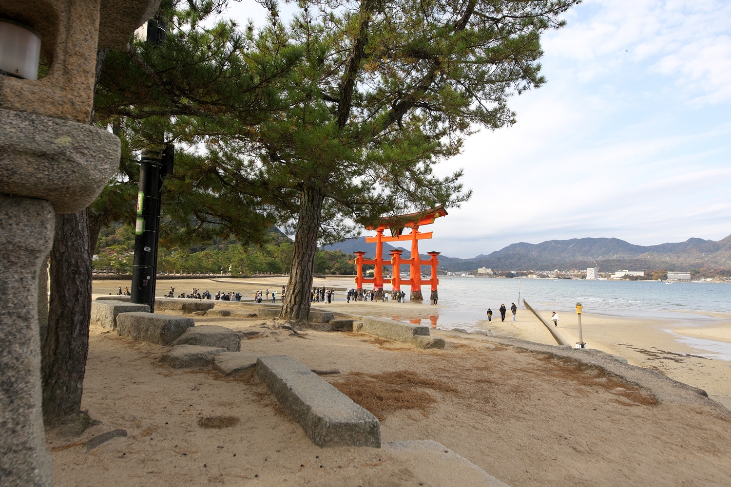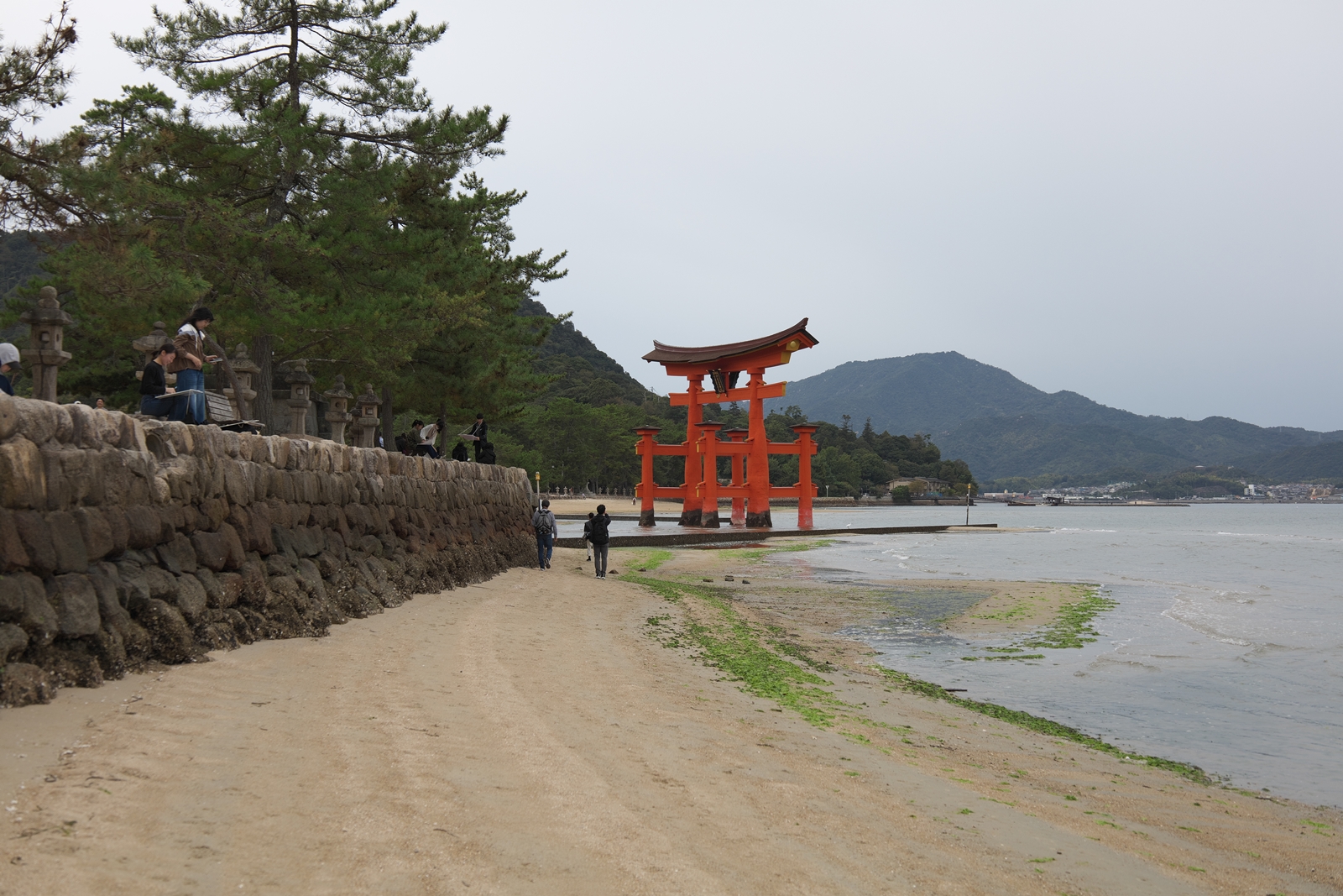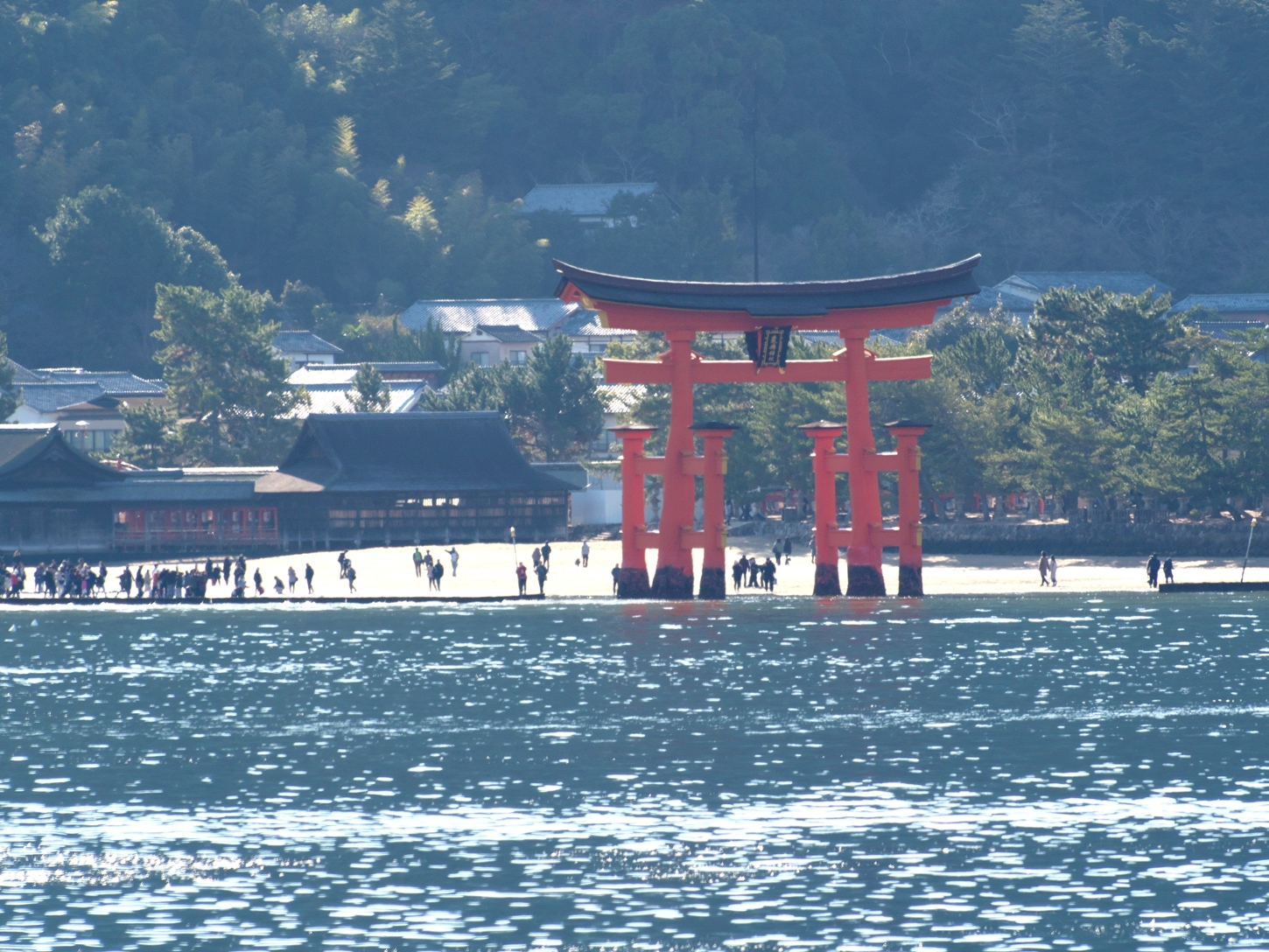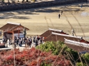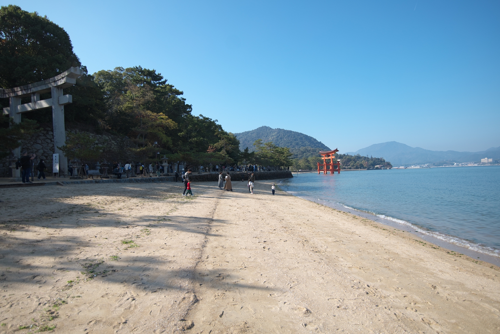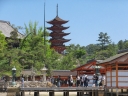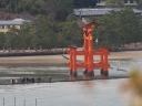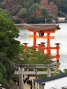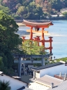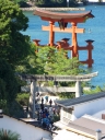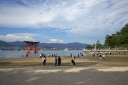 | 干潮前後の時間に来島時は先に大鳥居へ | 干潮から2.5時間後ですが、未だ神社前の砂浜を歩けました | やはり大鳥居の人気は抜群ですね! | 厳島神社入り口からすぐの客(まろうど)神社、檜皮葺の屋根の修理を終えて美しい | ||