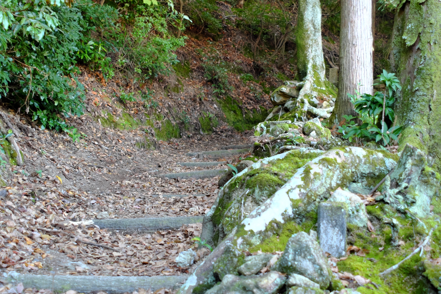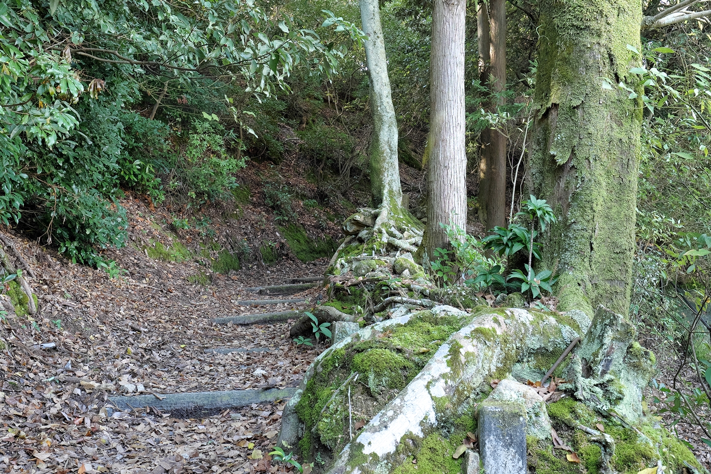 | 大きな樹の切り株に色々な種類のコケが群生しています | ㊙展望台への入り口ですが、右側の土止めの板塀が次第に崩されて来ました | 紅葉谷川です・・・ | ||