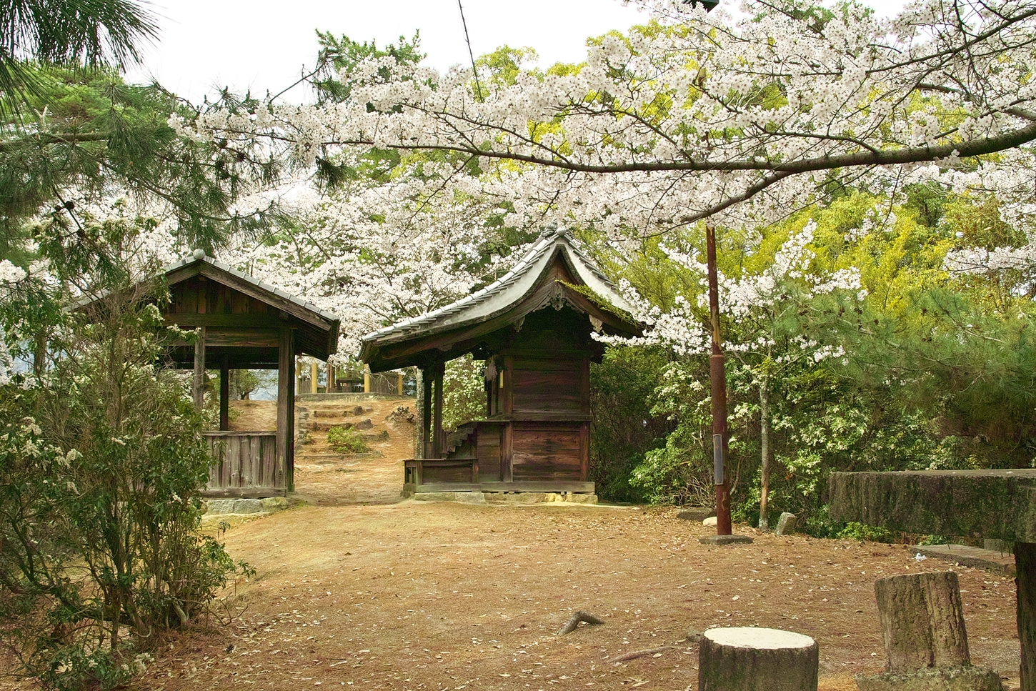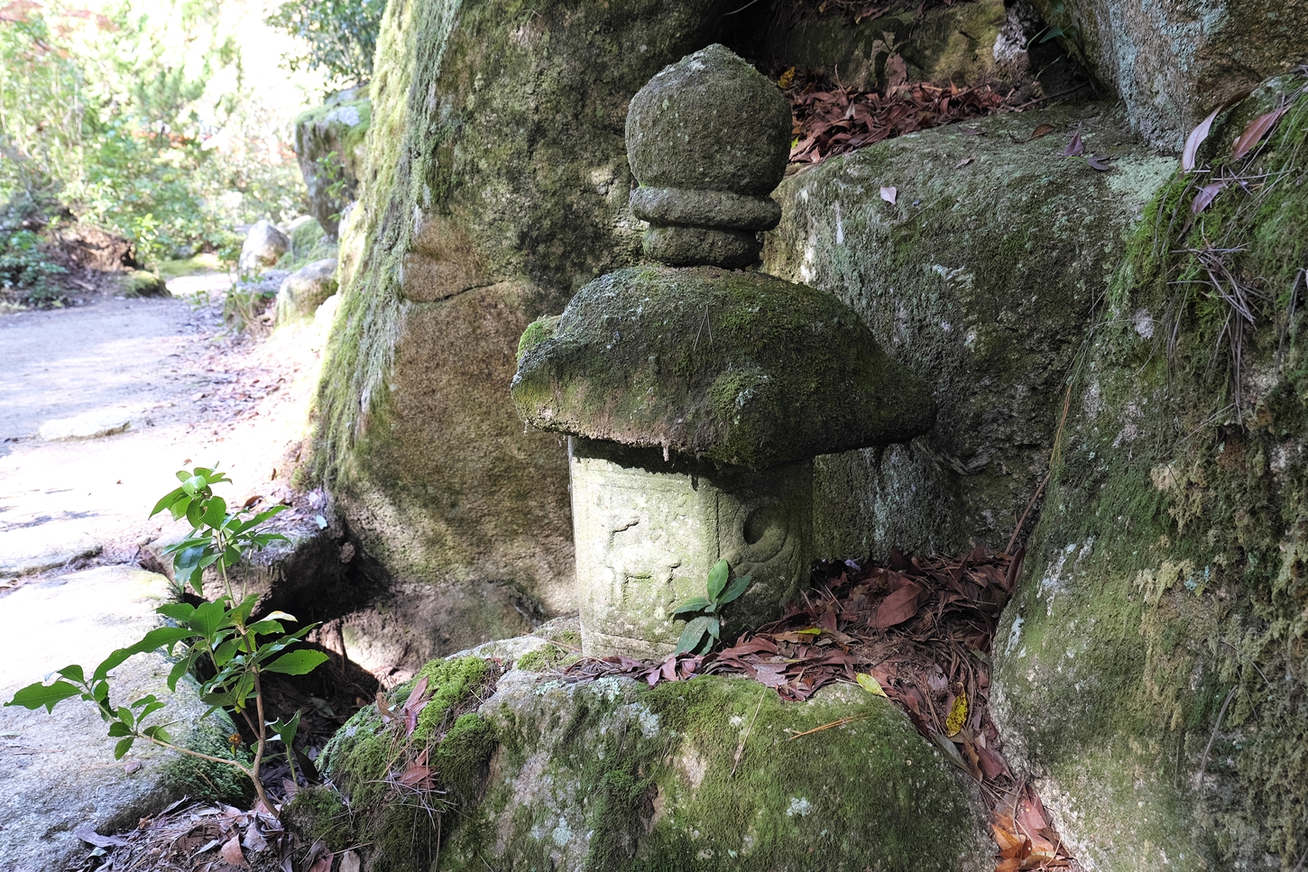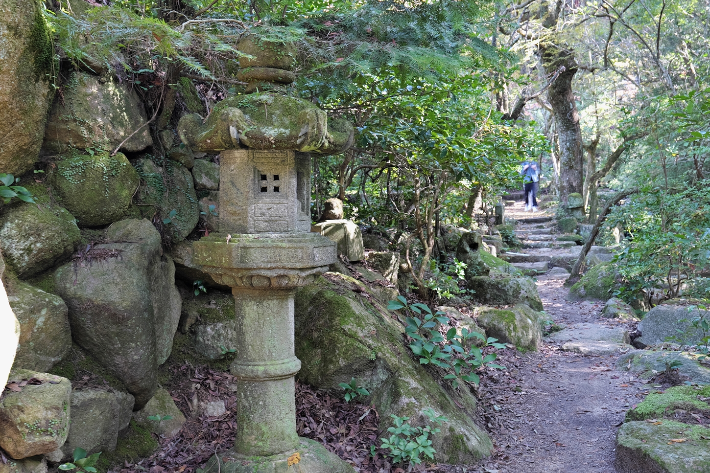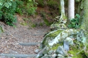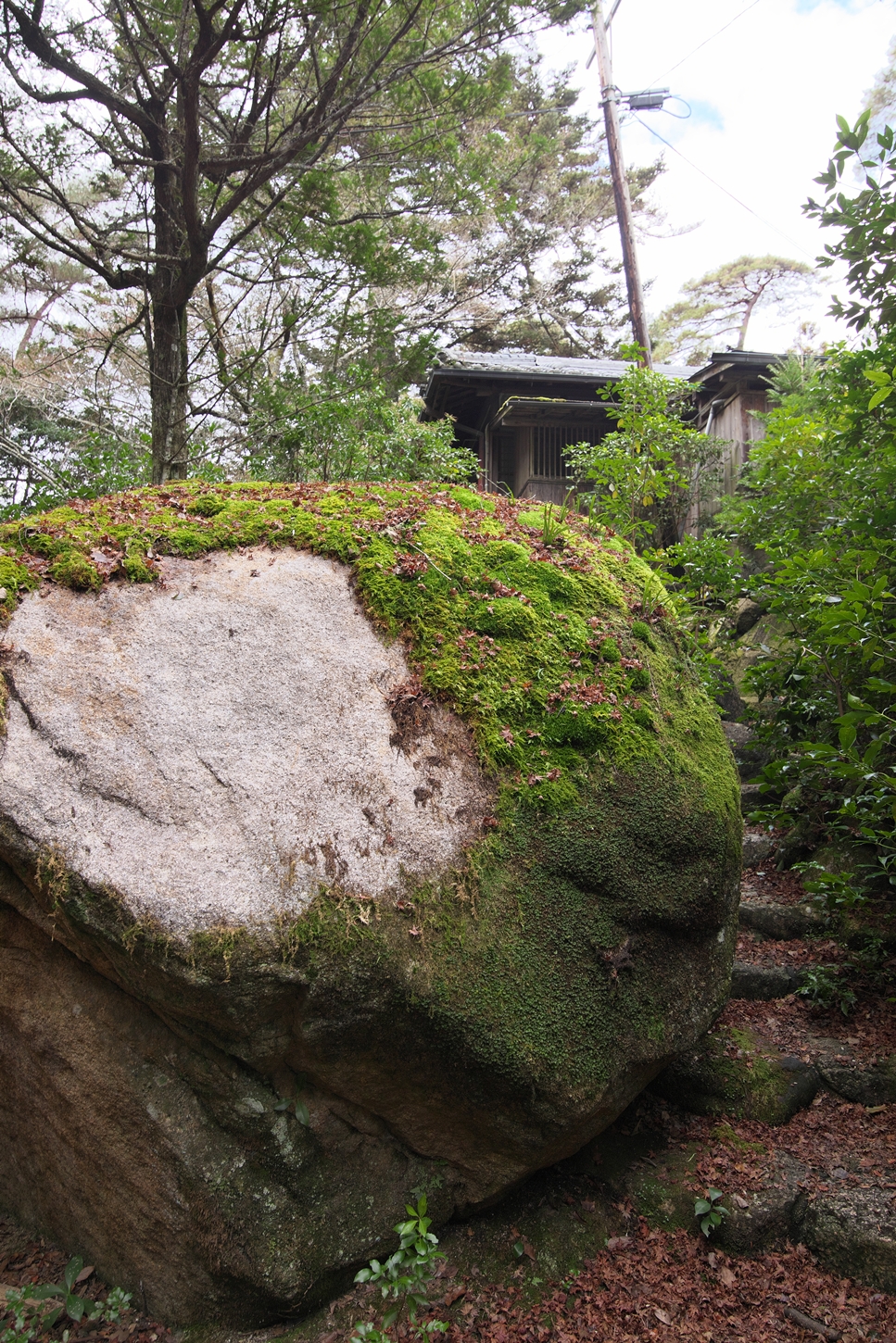 | ㊙展望台に行く途中、今日は北之神社さまに・・・ | closed areaにて鹿さんfamily?.がゆったりとお過ごしに | 北之神社さま本殿の左奥にお地蔵様が祭られています。更にその左後方は獣道でして、うぐいす歩道から駆け下りて来た鹿くんが写っています | 神社さま本殿は勿論、こちらも美しく整えられています。宮島の方々の信仰心の深さを垣間見るような気持ちに | 180度、反転しまして海側の風景です | 今来た小路は通らずに(獣道では無くて)人間様用の小路&鉄製の階段を進めばうぐいす歩道に。右側の舗装路はうぐいす歩道、左側は至 神社さまに |