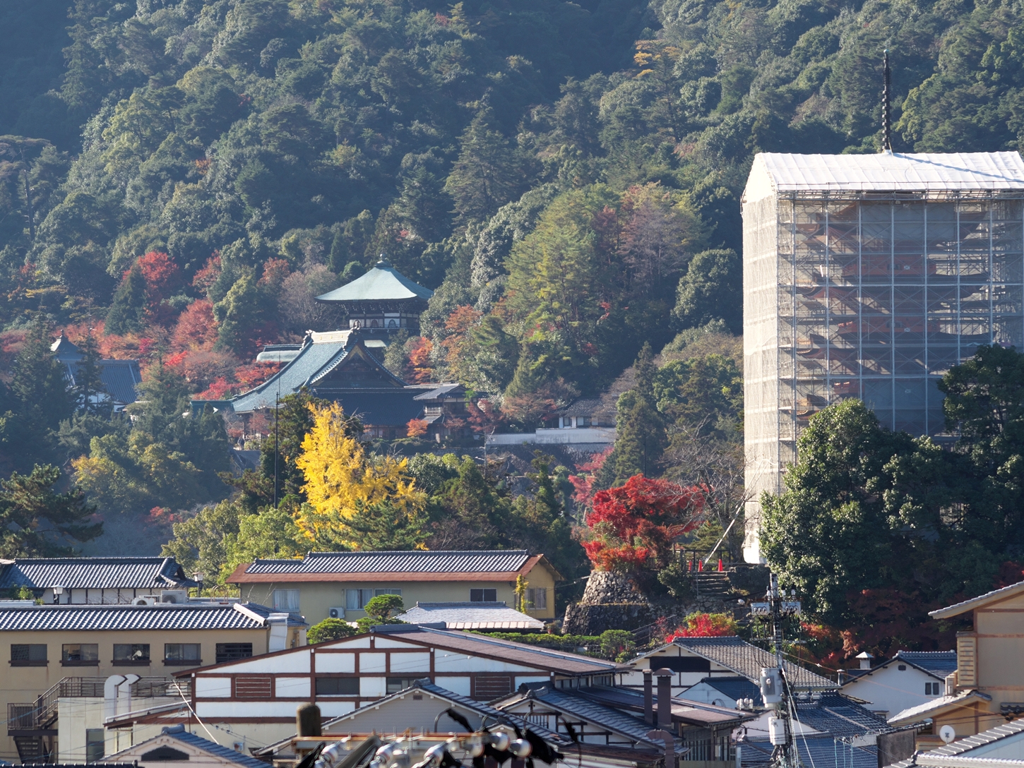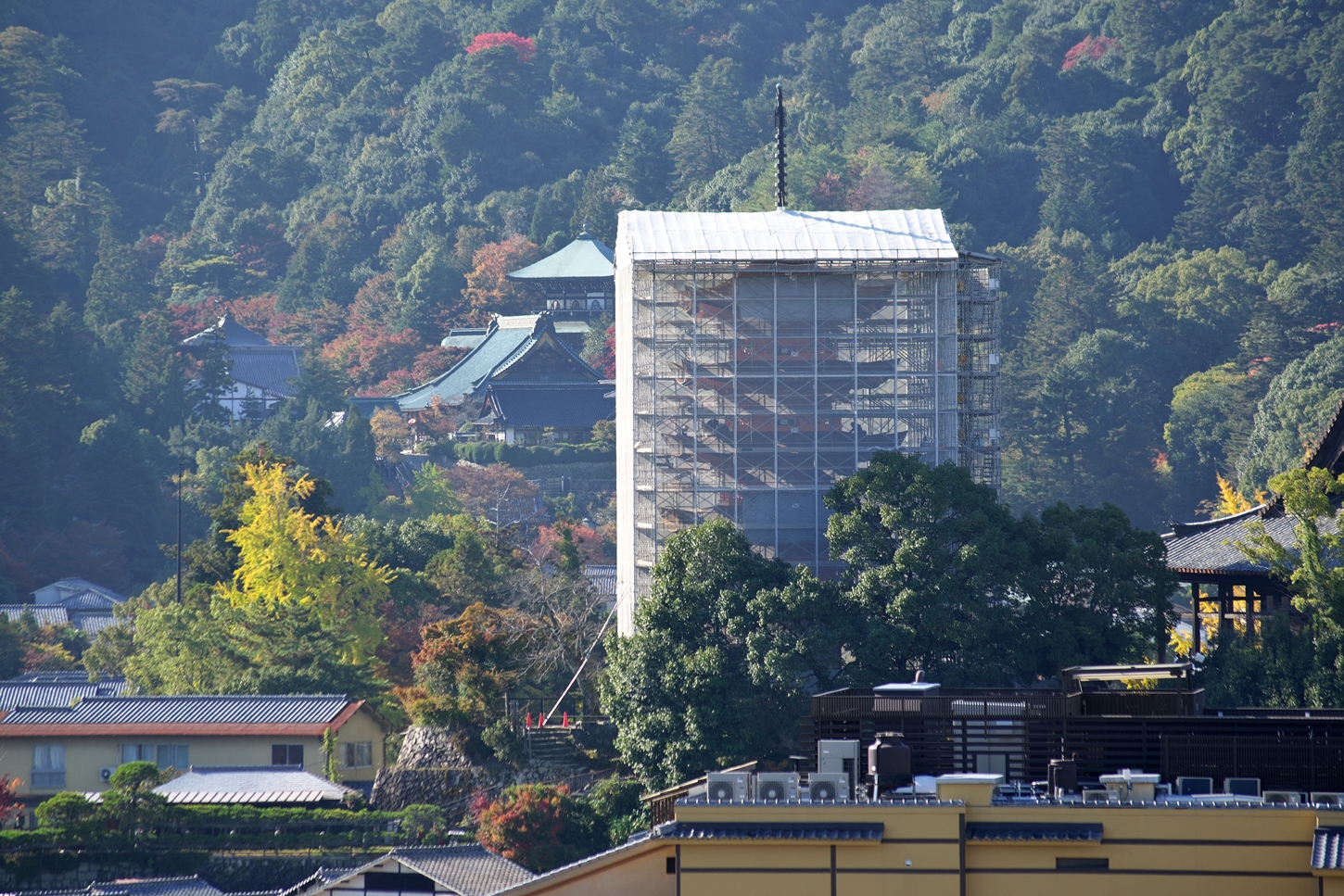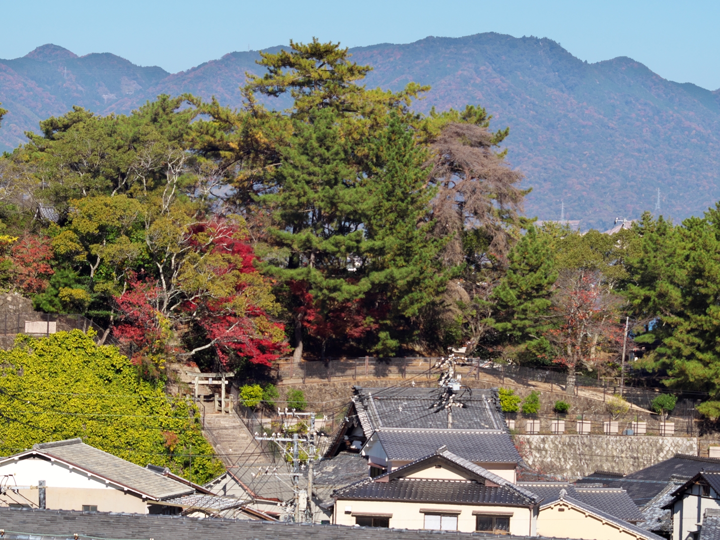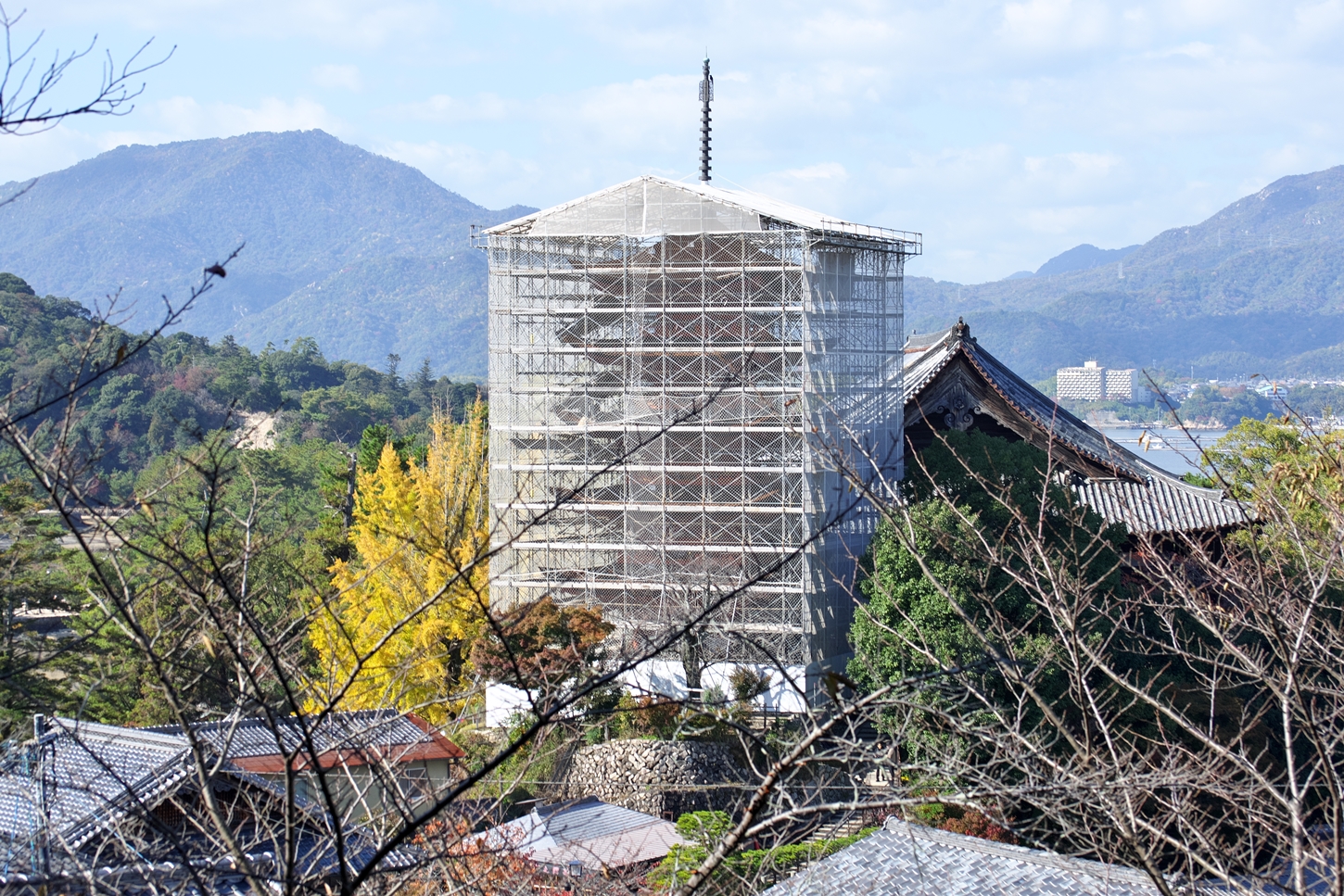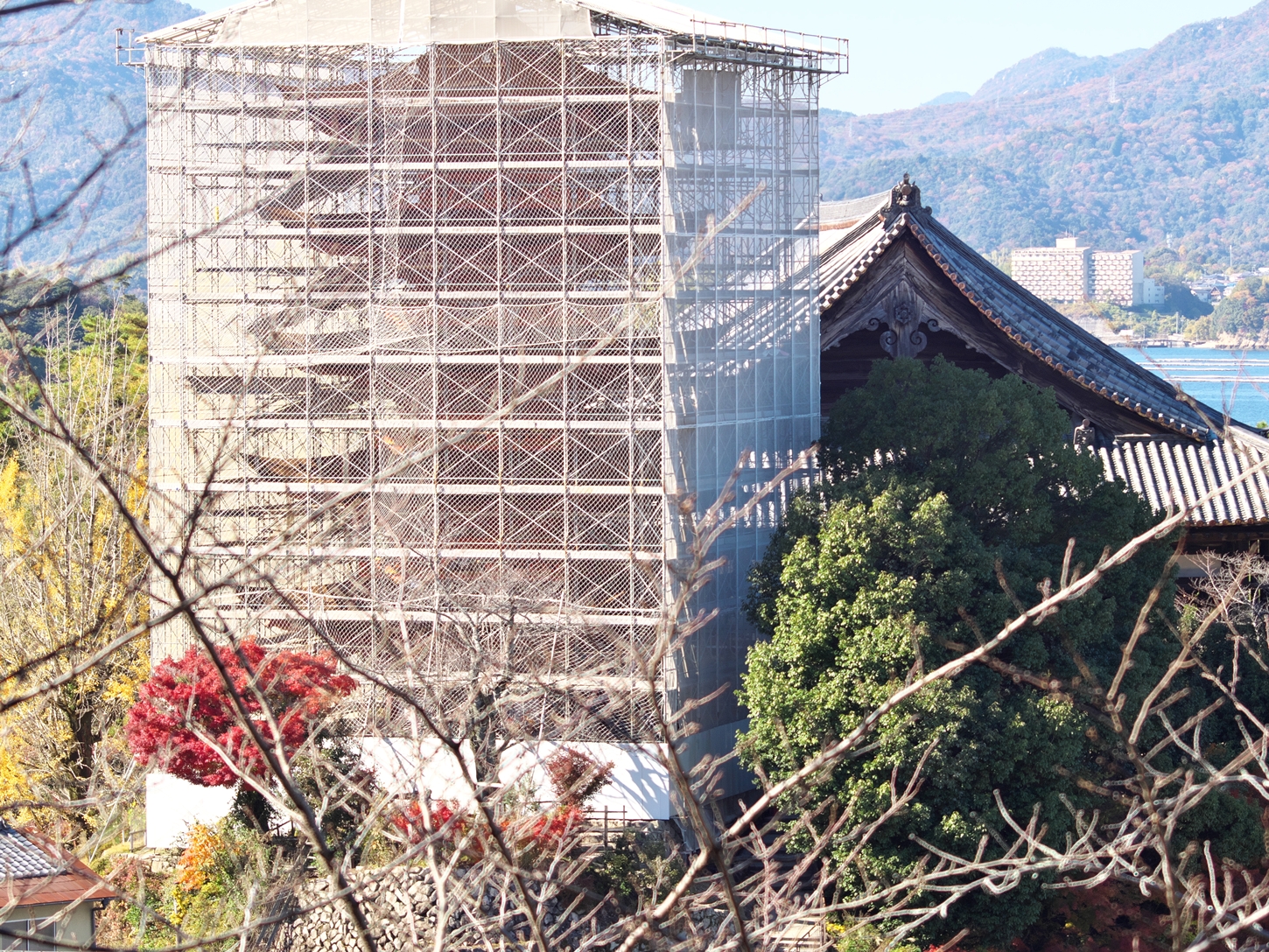 | これこそ今シーズン最後の紅葉でしょうかね・・・・ | 大好きな場所ですが、右手背後には多宝塔周囲に足場が組まれて大修理中です | 遠くに広島市西区井口台の団地の姿が | |||
