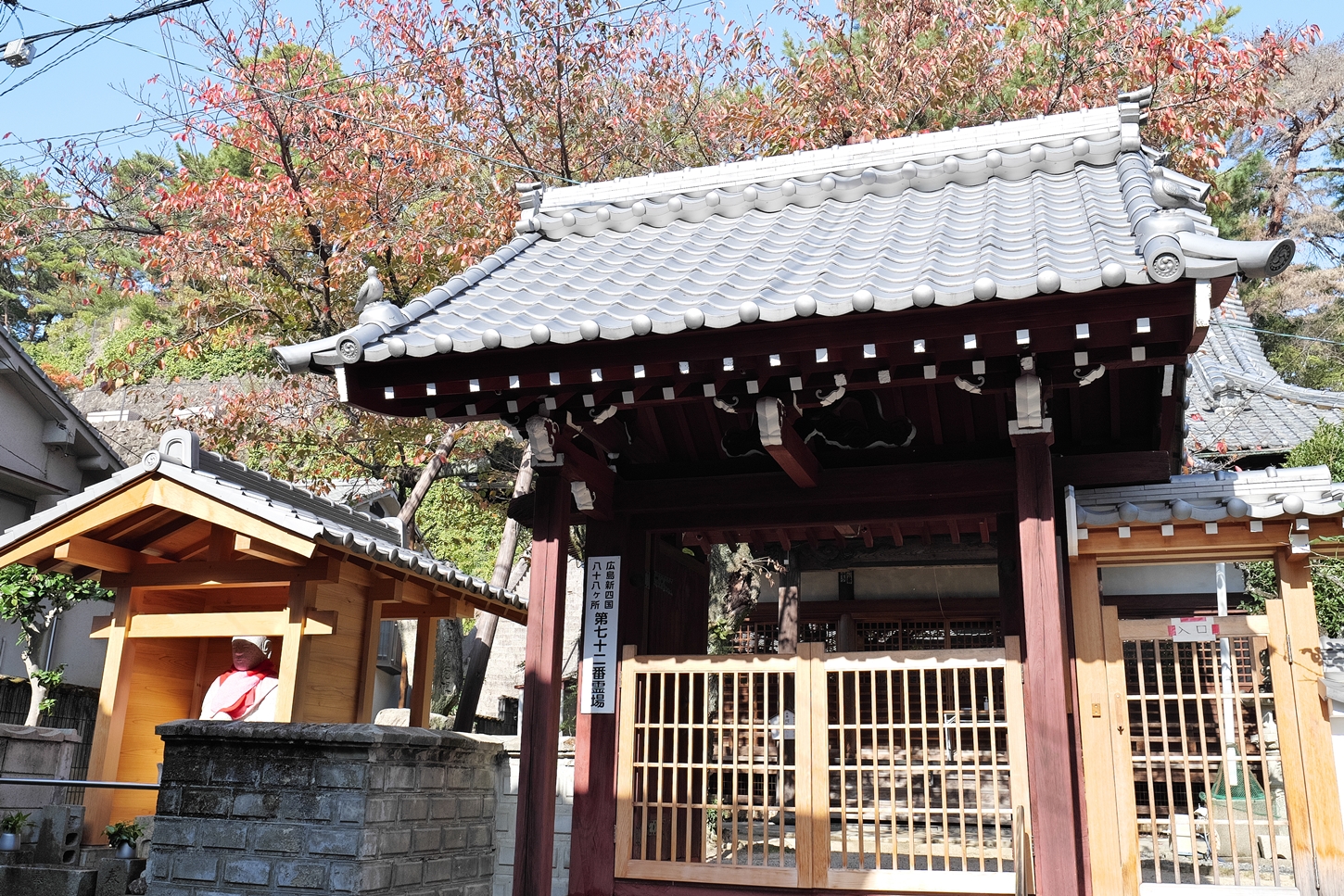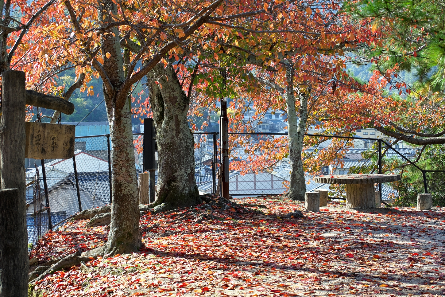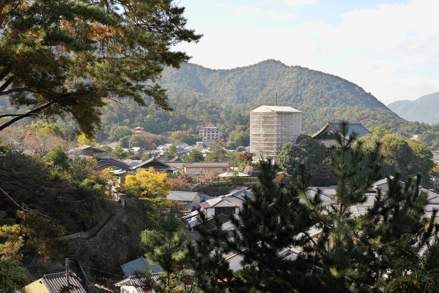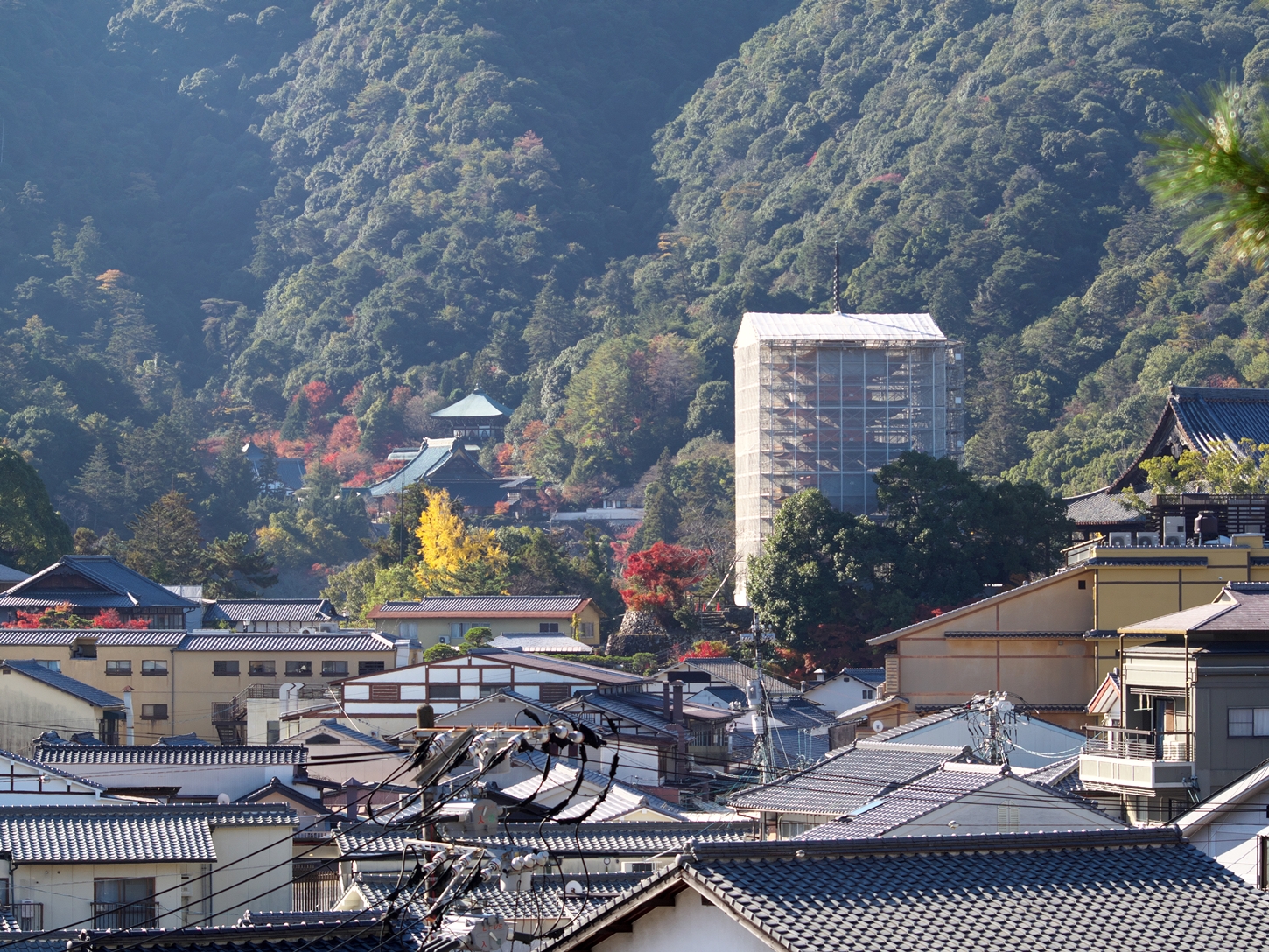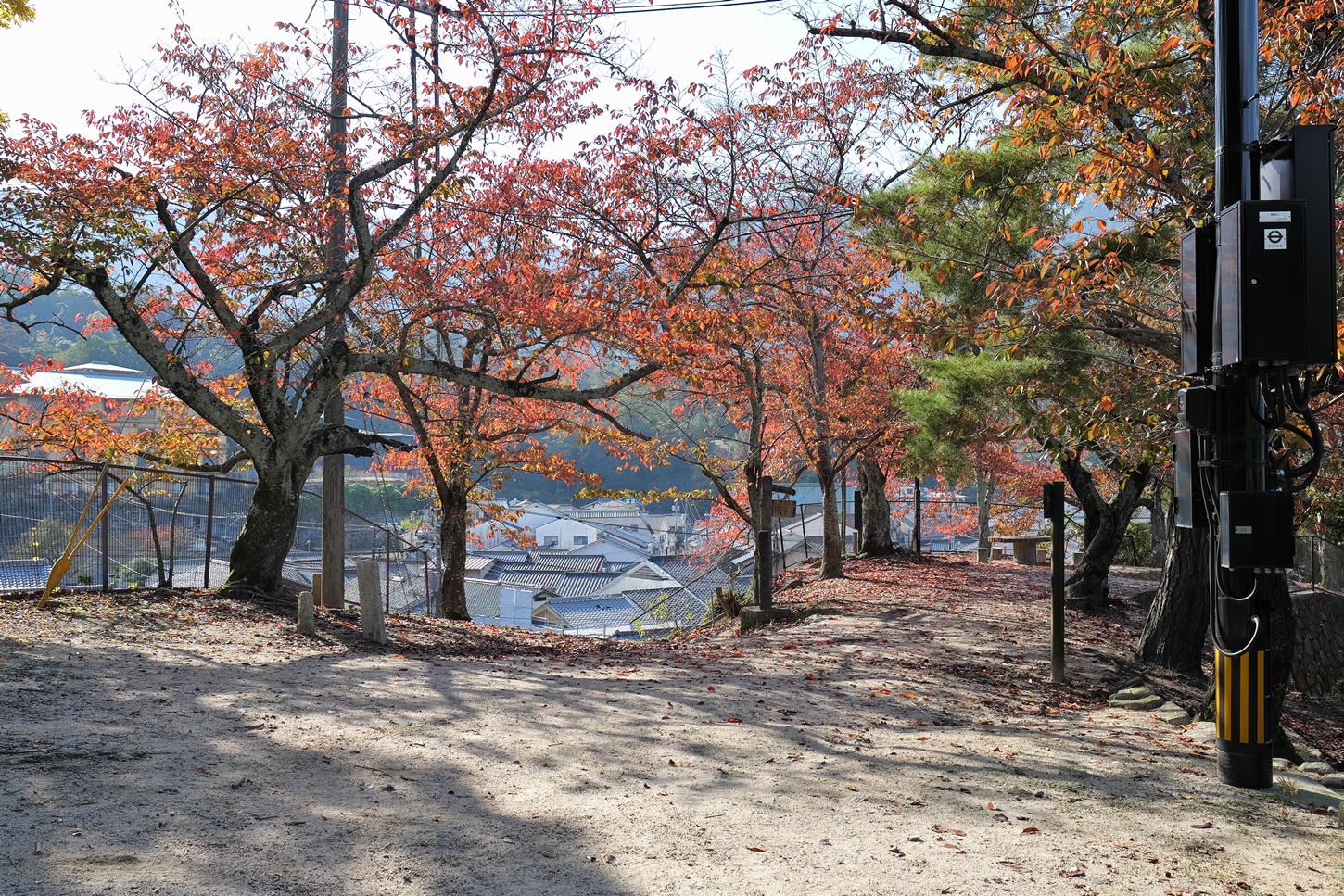 | これこそ今シーズン最後の紅葉でしょうかね・・・・ | 大好きな場所ですが、右手背後には多宝塔周囲に足場が組まれて大修理中です | 遠くに広島市西区井口台の団地の姿が | |||