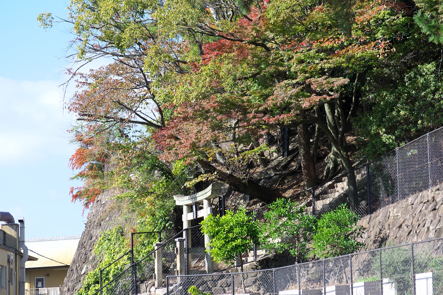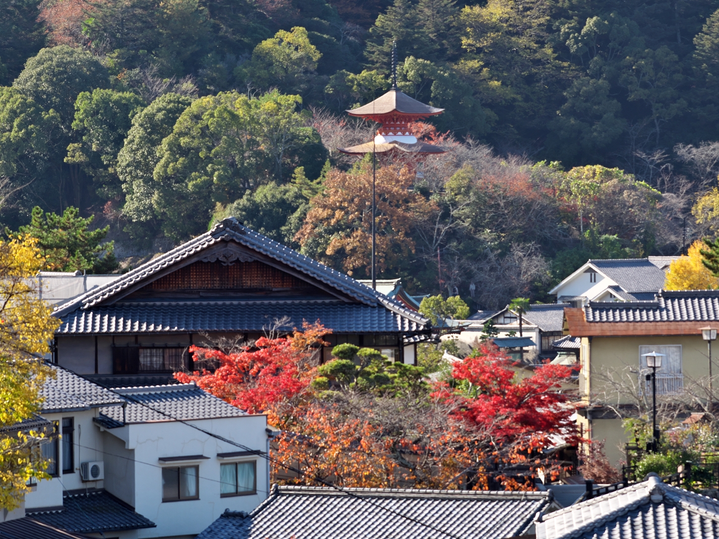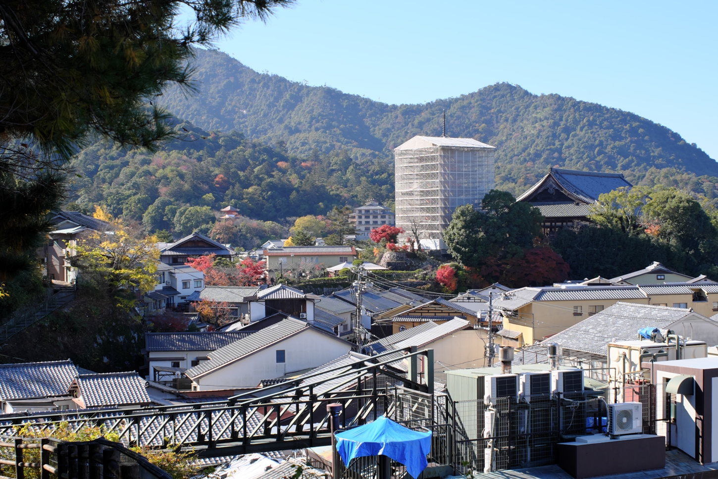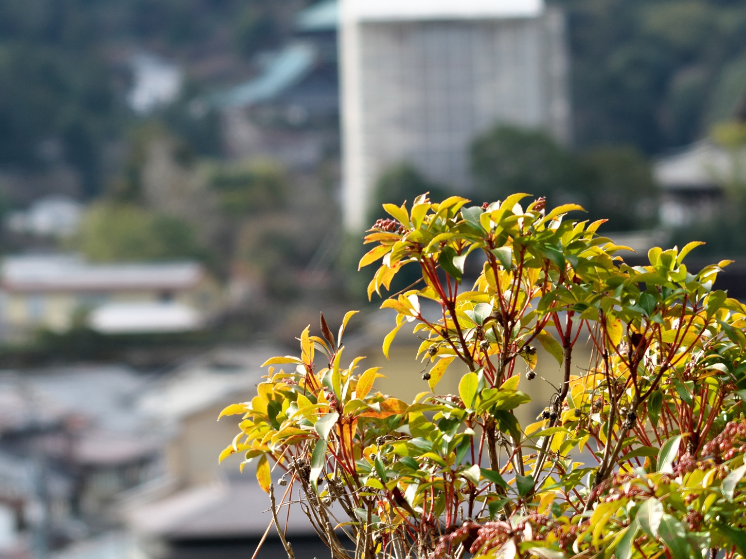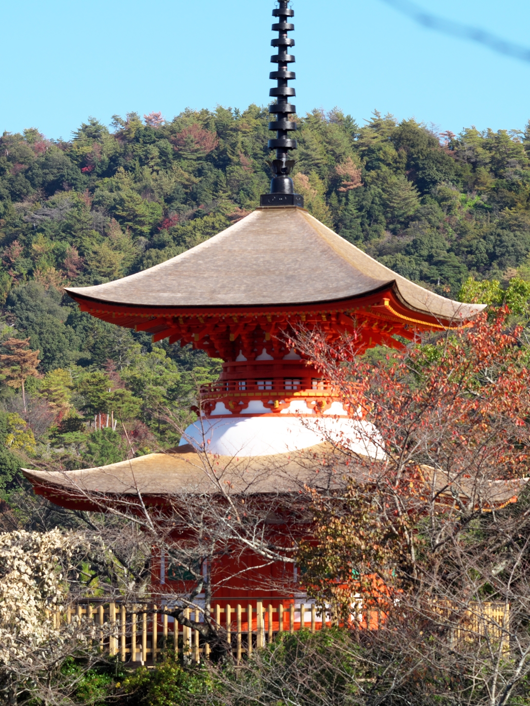 | これこそ今シーズン最後の紅葉でしょうかね・・・・ | 大好きな場所ですが、右手背後には多宝塔周囲に足場が組まれて大修理中です | 遠くに広島市西区井口台の団地の姿が | |||