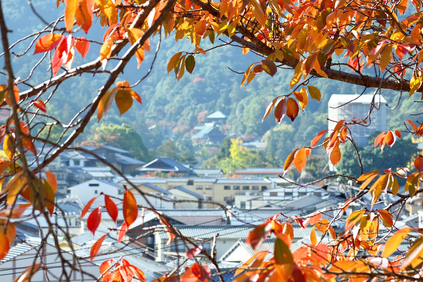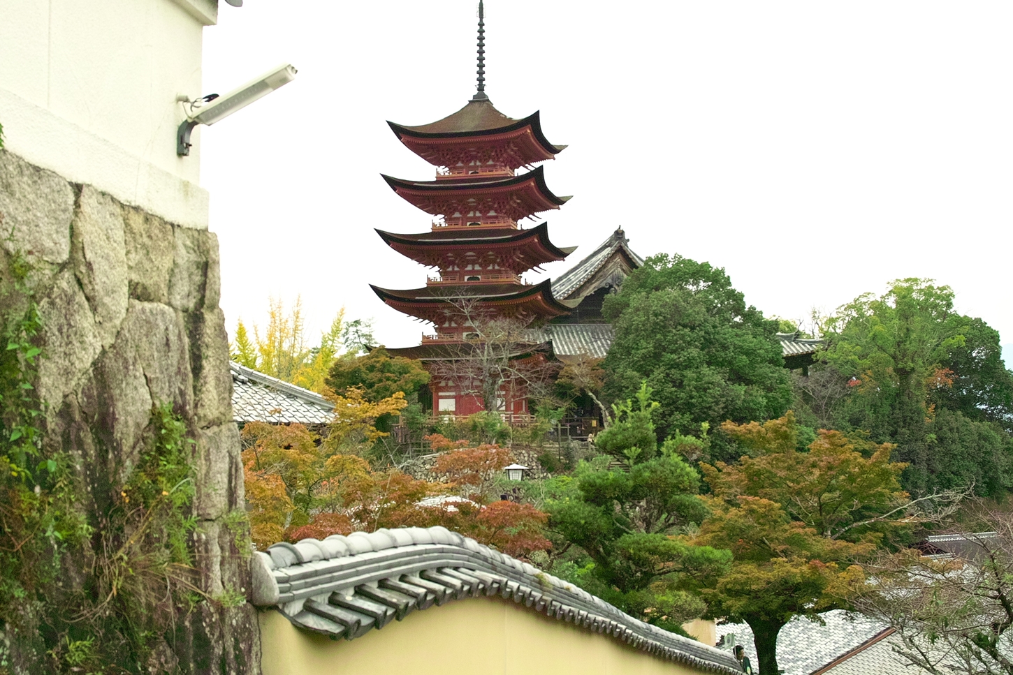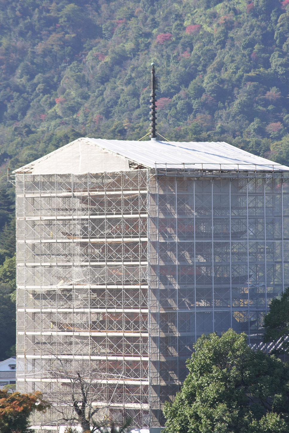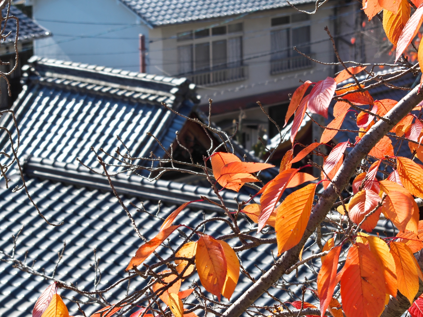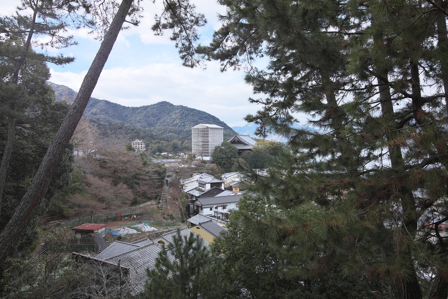 | これこそ今シーズン最後の紅葉でしょうかね・・・・ | 大好きな場所ですが、右手背後には多宝塔周囲に足場が組まれて大修理中です | 遠くに広島市西区井口台の団地の姿が | |||