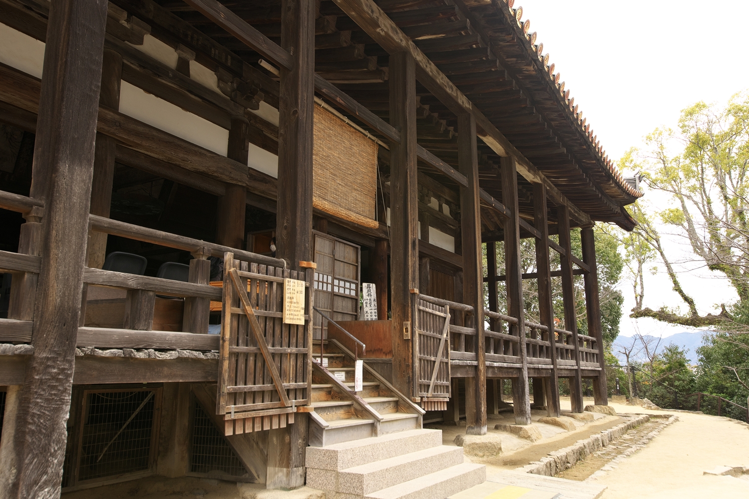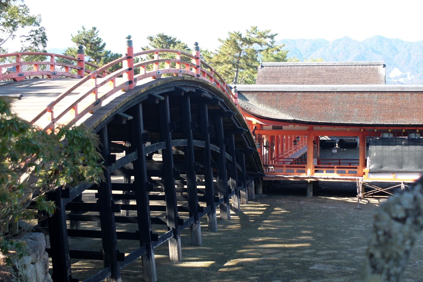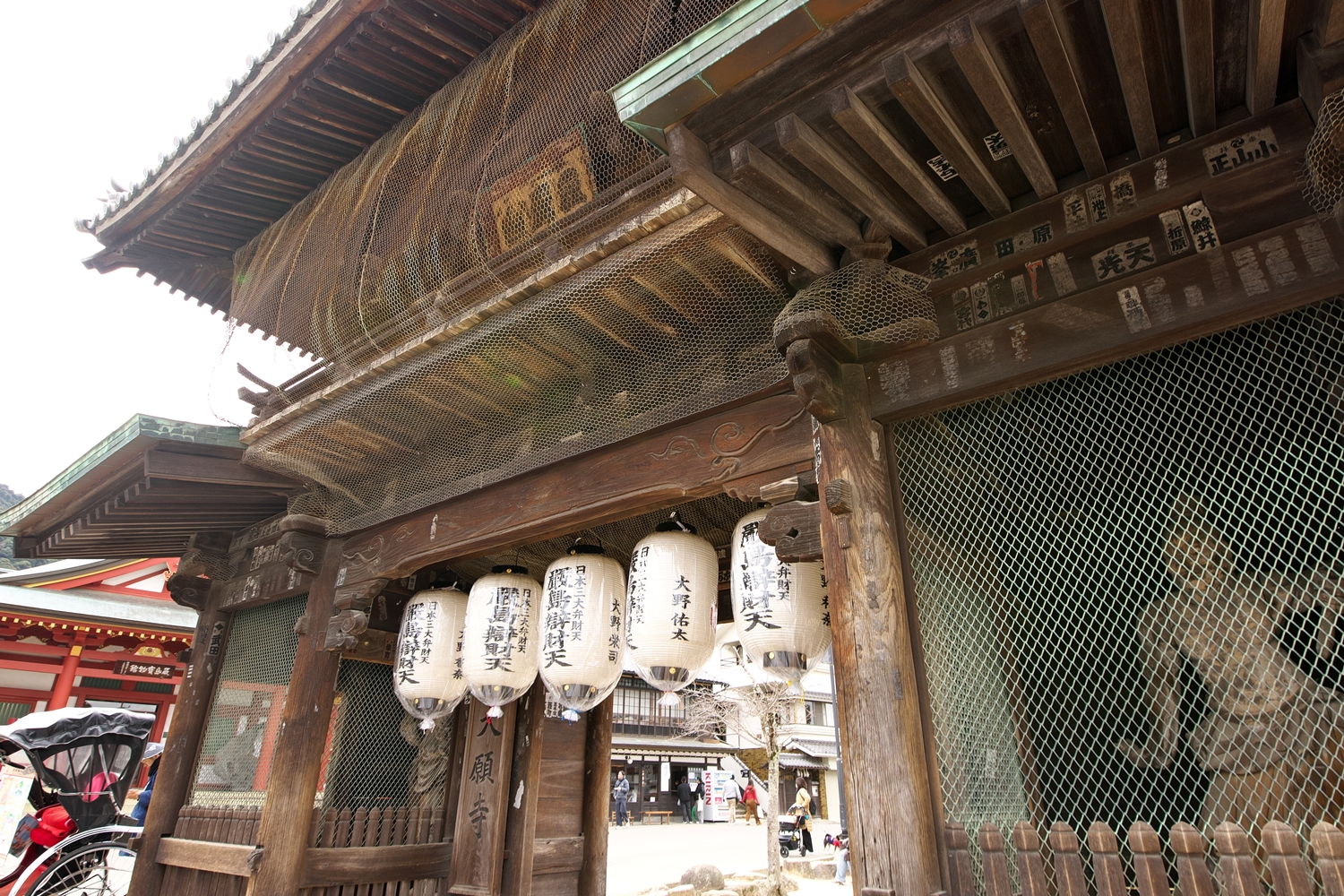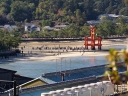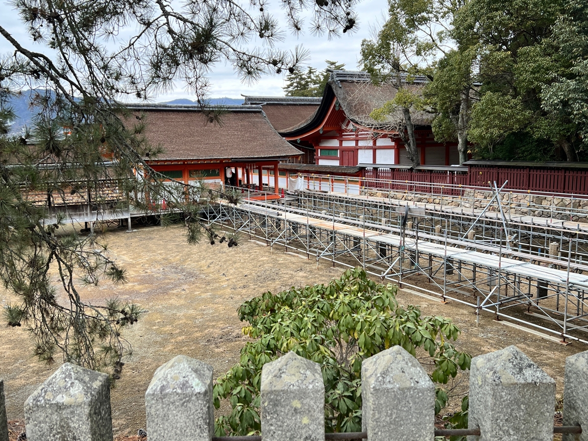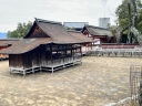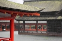| 右楽房下部の足場です | 大鳥居をバックにしての一番人気の撮影スポットで順番待ちの列が! | 西廻廊、能舞台・能楽屋ですが、この方向からは干潮の時だけに眺められますね | 大願寺に移動しました | ||
