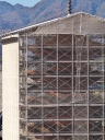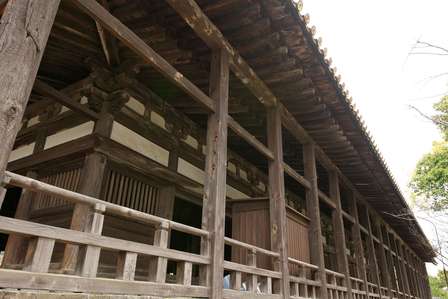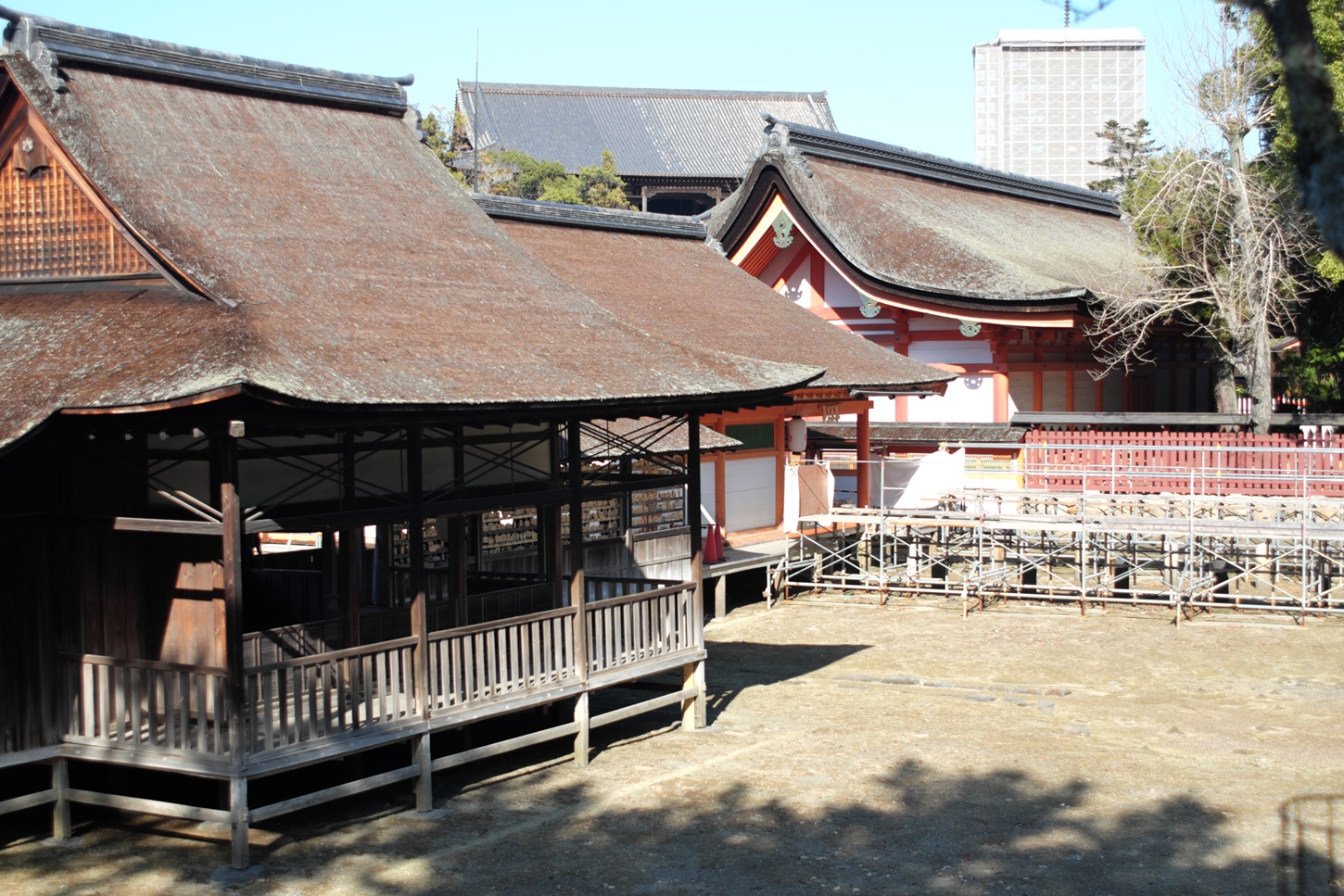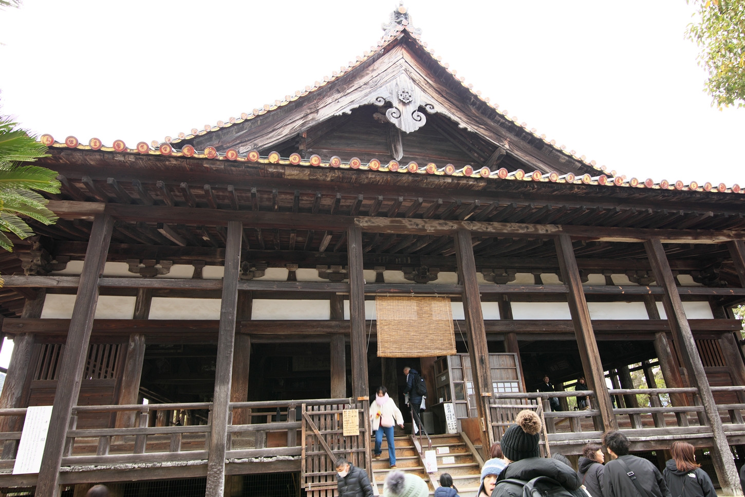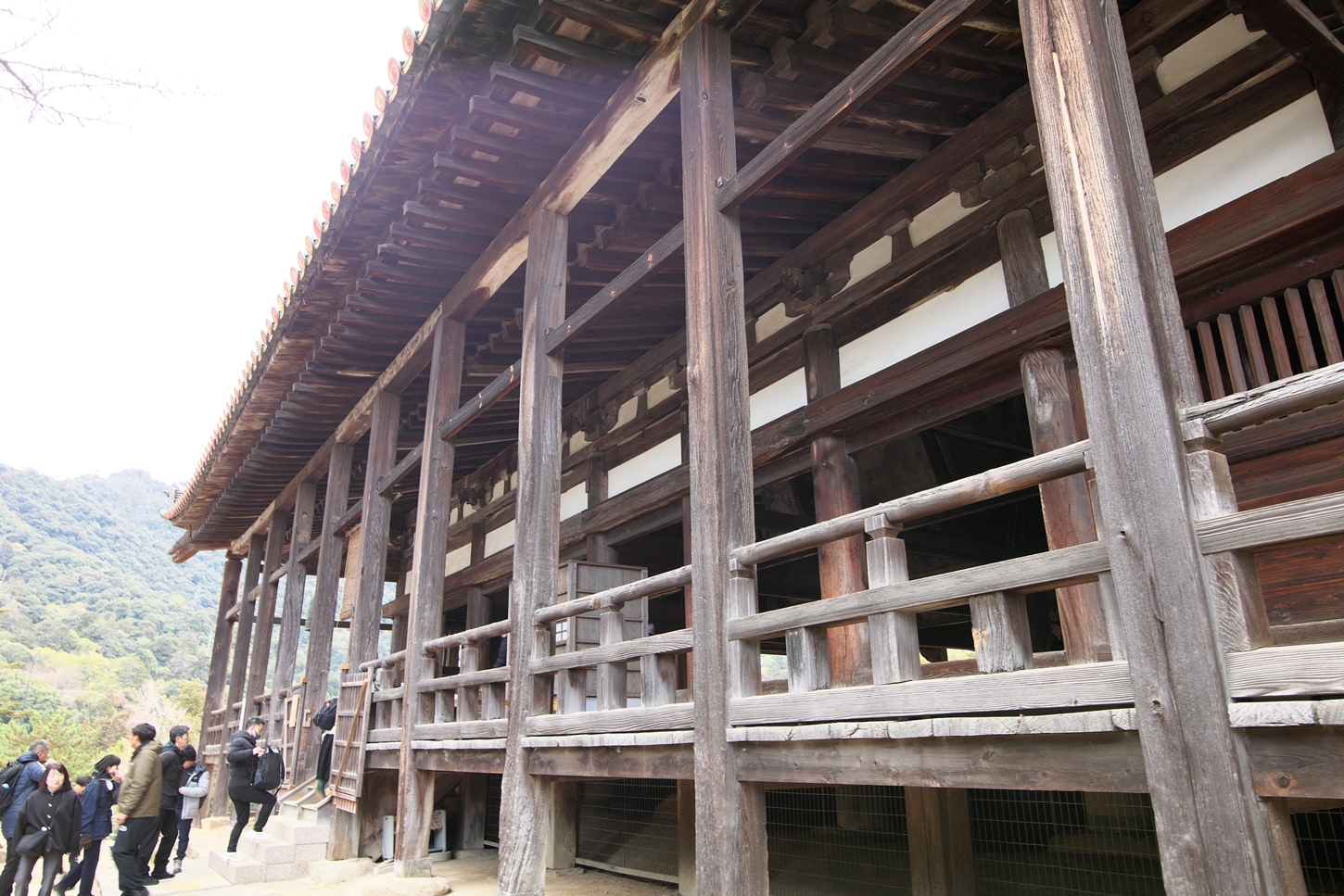 | 右楽房下部の足場です | 大鳥居をバックにしての一番人気の撮影スポットで順番待ちの列が! | 西廻廊、能舞台・能楽屋ですが、この方向からは干潮の時だけに眺められますね | 大願寺に移動しました | ||