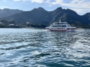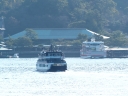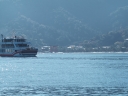 | 帰りのフェリー甲板からの眺め。呉の海上自衛隊の艦船です | 訓練中だったのでしょうか...ビックリする程の急旋回をされました💦 | 瀬戸内海汽船のランチクルーズ船がやって来ました | 広島・宇品港を出港.... 厳島神社前沖で反転後、宮島港に寄港します |
