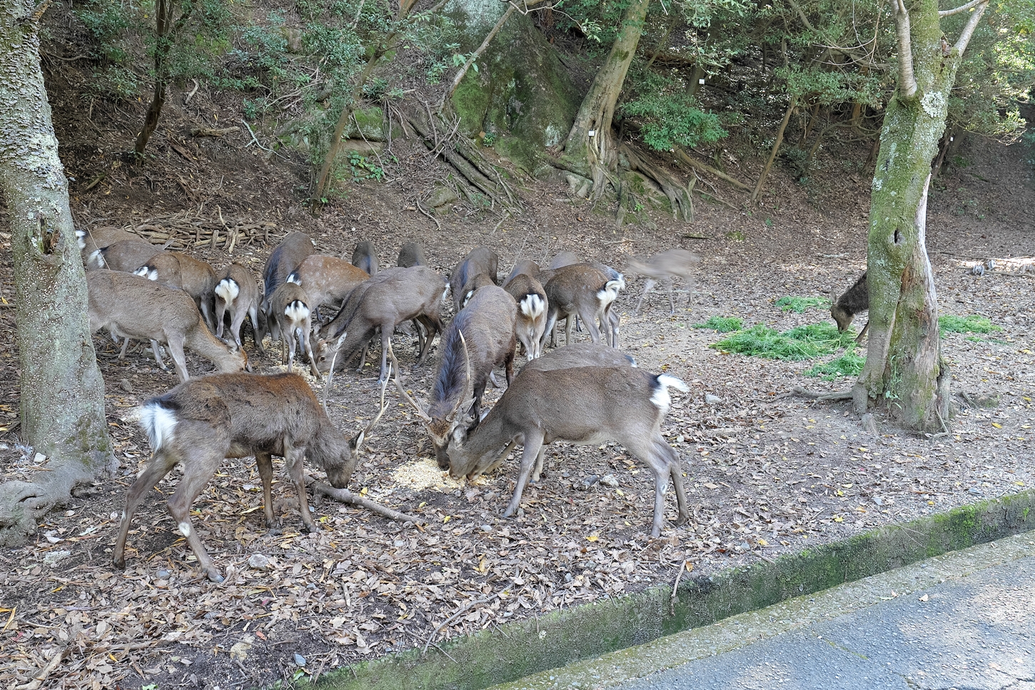 | ㊙展望台、山側から入った景色です | ㊙展望台・・・ついつい、ここに来ると写真を撮らずにはいられません | うぐいす歩道、紅葉谷方向です。右側の土手を進むと☜2枚左横の写真の場所に・・・ | ここから左側向こうには広場が有り鹿さんの一団が | 中央やや右寄りの立位の鹿さんは、こちらのボスさま。立派な角は秋に切断されています | こちらは母子・・・だと思います |