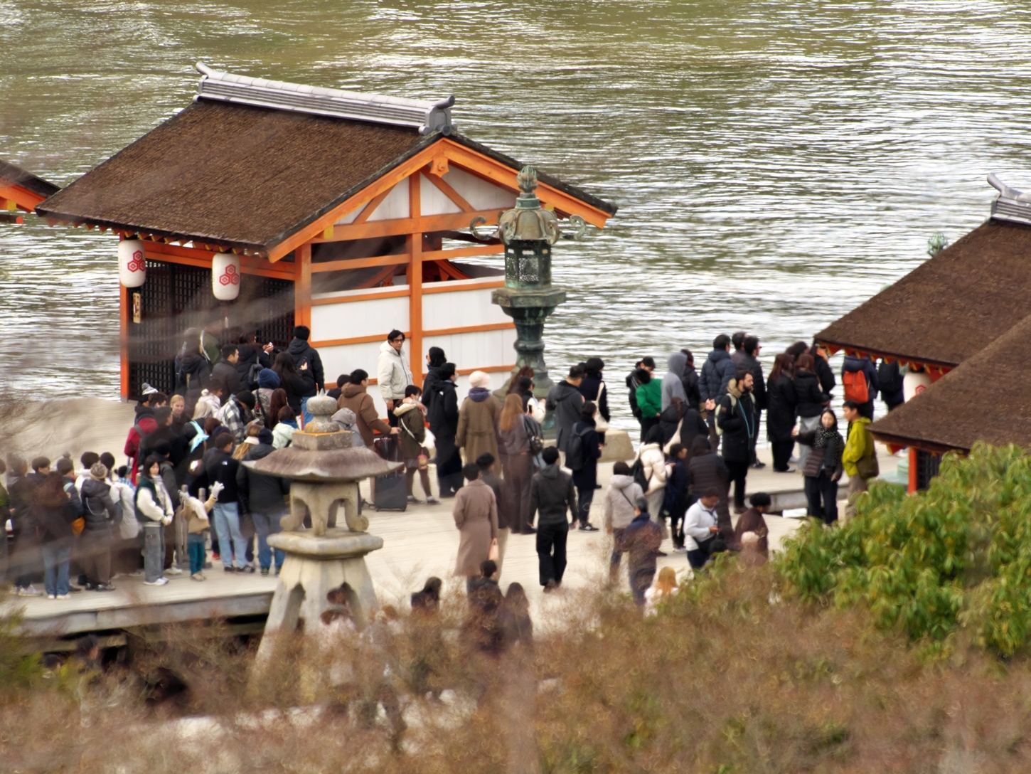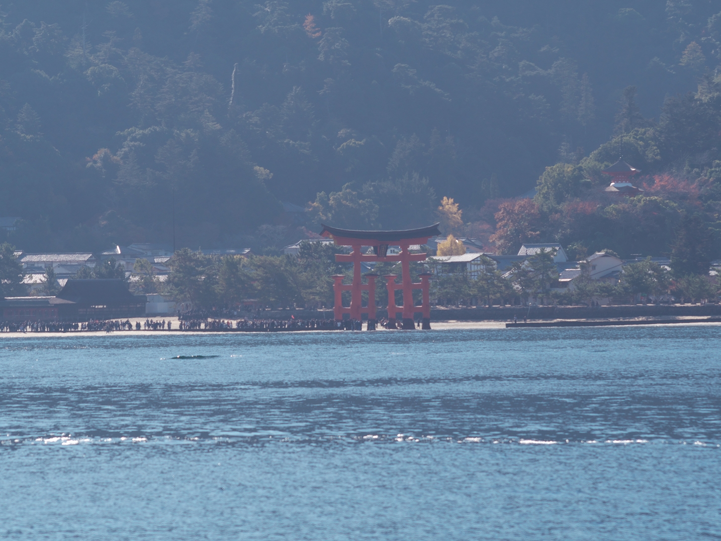| 肉眼では?でしたが、PCで画像修正をしつつ鴨の一団だと判りました | 西松原です。いつもここからボケ~と海を眺めていた私です | 来島後1時間が経過しましたが、既に大鳥居より沖の側の砂浜は消えてしまい海の底となりました | 厳島神社の人気撮影spotの平舞台, 火焼前ですが未だひと気は無さそうですね | |||