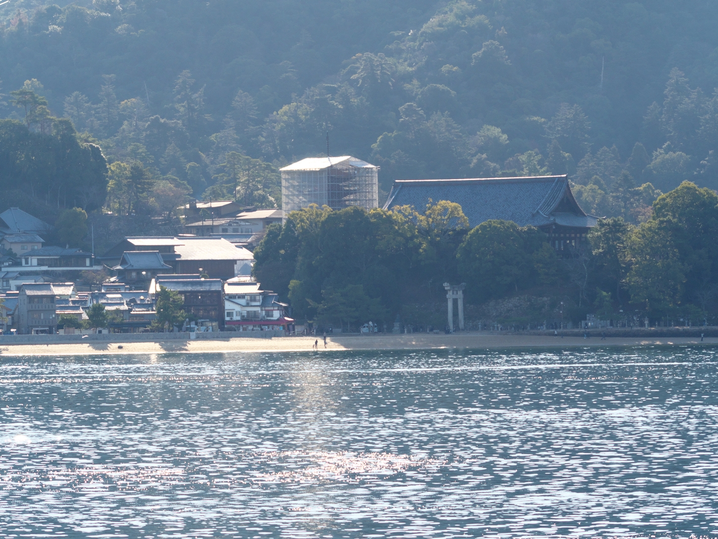 | 夜の暗闇と空の薄明るさとの均衡がギリギリ保たれている、そんな瞬間の対岸の明かり...美しいなあ~って感じちゃいました | 御笠浜前に広がる砂浜の先・・・これ程迄に沖に向かって歩いた事は無いような...爽快です | 画像正面よりやや左寄りの高台に足場が組まれた所。中には多宝塔が有り現在修復作業中です。観光areaからは離れた若干、地味な存在ですが私は大好きです | 右上に見える大屋根の建物は豊国神社(千畳閣)です | 宮島フェリーターミナル方向ですが、こちらも砂浜が見えます | ||