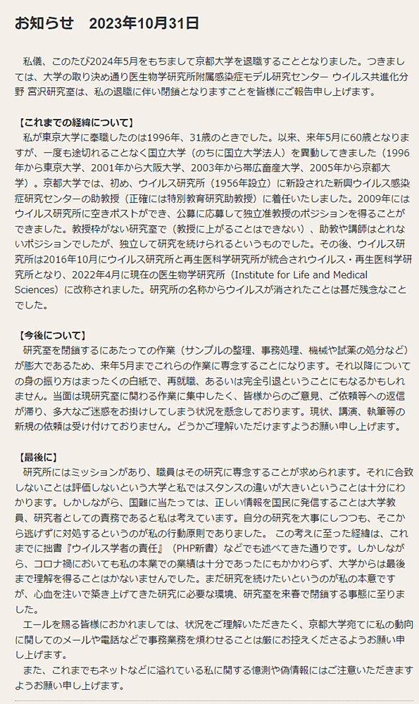 宮沢孝幸先生、京都大学退職について思うこと!日本のために立ち上がる人が日本人から足を引っ張られるこの歪んだ社会を考える! |